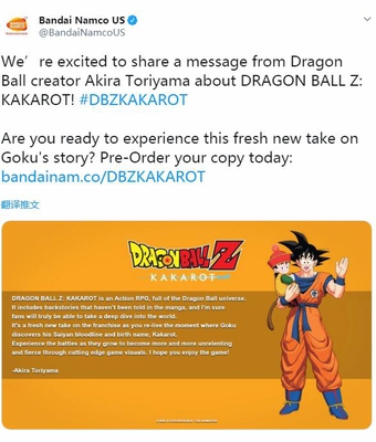 万代南梦宫今日发布官方推特,给玩家们带来了鸟山明的问候:“《龙珠Z:卡卡罗特》是一款ARPG,忠实呈现整个龙珠宇宙。它将包含漫画中甚至根本没有提及的全新背景故事,我相信粉丝们一定能够深入的投入这个世界。”