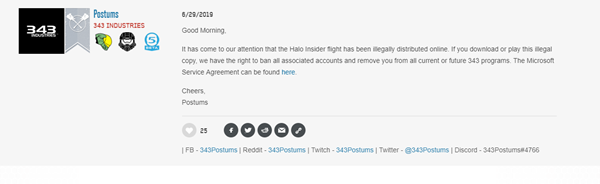 目前,《光环:士官长合集》正在PC端上进行测试,而《光环:致远星》的多人游戏作为“士官长合集”的其中一部分也在PC上进行测试。本次测试343工作室只开放了不到1000个名额,然而有一些玩家却正在用非法手段进入本次测试,对此343工作室表示将对这些玩家采取惩罚措施。 在玩家使用不当手段进入游戏测试版的事件发生后,343工作室在游戏的论坛中发布了一篇警告贴,表示一旦发现玩家通过非法手段进入《光环:士官长合集》的PC测试版,官方将会对玩家的帐号进行封禁。 本次《光环:士官长合集》的PC端测试只是一次小范围的测试,而这次测试也即将在今天结束,至于PC版《光环:士官长合集》的发售日,官方尚未公布。 |