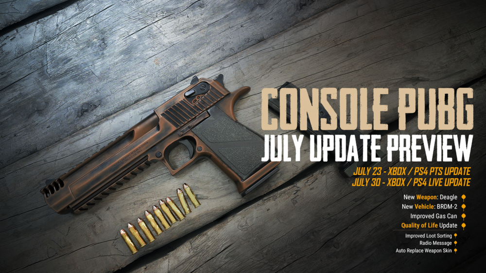 PUBG公司官方宣布《绝地求生:大逃杀》主机版最新更新将于2019年7月30日正式上线,登陆Xbox One和PS4平台。同时,在更新正式上线前,玩家们将有机会在2019年7月23日进入测试服参与更新测试。 本次主机更新主要内容如下: 新武器沙漠之鹰(Deagle) 沙漠之鹰将于本次更新中正式加入游戏,这是到目前为止《绝地求生:大逃杀》中伤害最高的手枪。更新过后,这把枪将在所有地图中以稀有概率出现。 新载具BRDM-2 BRDM-2为特殊载具,玩家们将只能够使用照明弹召唤,此载具为水陆两栖,十分方便快捷。 燃料桶改善 更新过后,游戏中的燃料桶将可被引爆,在爆炸范围内的所有玩家都将受到爆炸伤害。 优化战利品分类 战利品分类将更加直观,玩家们可以更好的整理背包 无线电信息优化 玩家们可以通过新的通信功能与队友进行更有效率的对话,总共有8种类型的信息可以选择。 自动替换武器皮肤 玩家可设定将捡起的武器自动换为自己所拥有的皮肤外观。 |