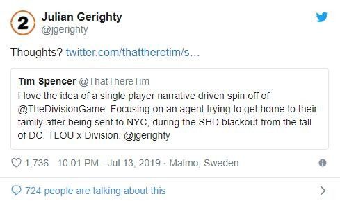 《全境封锁》并非一个以叙事为核心的游戏。尽管游戏以纽约和华盛顿特区为背景,营造出优秀的“城市战场”气氛,但系列核心在游戏内容上。不过育碧似乎并不满足于此:在北京时间昨日(7月14日)《全境封锁2》的总监Julian Gerighty,在推特上公开向粉丝们征集制作“一款单机、叙事型”全境封锁衍生游戏的意见。 来自TT Games的关卡设计总监(level director)Tim Spencer,在推特上提出了一个设想:制作一款单机叙述导向的《全境封锁》衍生游戏。时间设定在《全境封锁》1、2代之间,故事聚焦在一名国土战略局(Strategic Homeland Division)特工(即玩家在游戏中的身份)被派往纽约后的回家之旅。Tim Spencer随后@了“全境封锁”官方推特和Julian Gerighty的推特。 Gerighty转发了这条推特,并回复“有何想法?(thoughts?)”,向玩家们收集对这个构思的意见。他还在随后的推特中开玩笑的说:“这是一个人们不会坚决反对的主意。” 粉丝们在推特上对叙事型衍生作品反馈总体是积极的,这并不意外。尽管本质上是一个类似“暗黑破坏神”的刷装备游戏。但《全境封锁》的写实设定,“城市战场”设定和“汤姆.克兰西”风格的军事冒险题材,为该游戏提供了绝佳的叙事素材。所有材料都摆在了桌面上,就看育碧有没有意制作出来了。 |