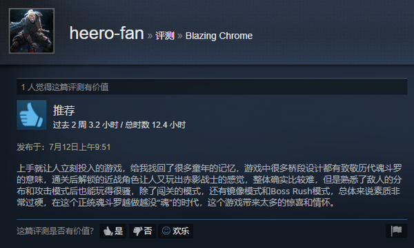 有着神似《魂斗罗:铁血兵团》风格的横版射击游戏《炽热合金》在7月11日正式登陆了Steam平台,获得了大量玩家的好评,目前游戏在Steam上收获130多篇评测,好评率达96%。 在这100多篇的评测中,简体中文使用者占到55个,可见中国玩家对这一《魂斗罗》的致敬者十分喜爱。 同时评测文中内,《魂斗罗》与《铁血兵团》(Hard Corp)等词语几乎是出现频率最高的词汇,看来很多玩家都把这款游戏当作了MD上最为人称道的《魂斗罗》续作《魂斗罗:铁血兵团》的精神继承者。 当然也有玩家提到本作只有6关的流程长度仍有待提升,虽然有着更具挑战性的硬核模式,头目连战功能,以及给大神玩家展示自我的全球排行榜存在,但如果能有更多后续关卡更新,应该会进一步扩展本作的可玩性。 在近期发售的新品中,《炽热合金》也是较受欢迎的一个,在发售当天就登上了Steam新品与热门商品榜单的第一位,受到了玩家的关注。 《炽热合金》由发行商CE-Asia负责大中华地区发行工作,游戏Steam国区定价58元,在CE-Asia运营的杉果商城中游戏首发优惠价为50元。喜欢《魂斗罗》《合金弹头》为代表的街机风格横版动作射击游戏的玩家可以通过Steam页面了解一下。 |