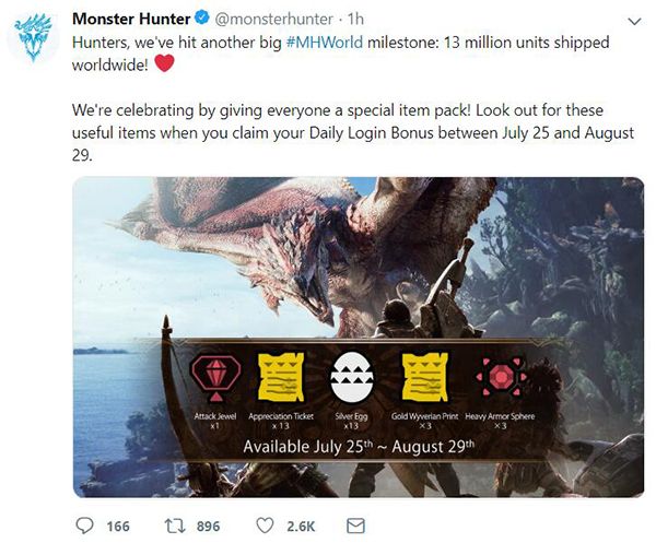《怪物猎人世界》出货量达1300万 官方庆祝送礼包