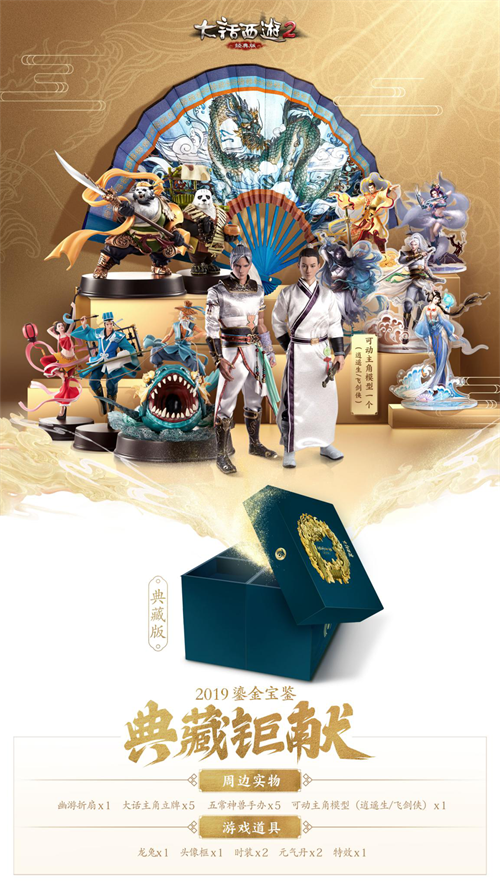 转眼又到了《大话西游2》鎏金宝鉴和大家见面的日子了,今年的鎏金宝鉴全新升级,不仅包含了分享版、珍爱版、白金版三个版本,更是新添了超值的典藏版。典藏版鎏金宝鉴作为今年龙族献礼的重磅回馈,内含的周边除了超高品质的可动主角模型,更是包括了此前公布的大话主角立牌、五常神兽手办、“幽游”折扇,一应俱全,值得珍藏! 你想早些拥有今年的鎏金宝鉴典藏版吗?7月25日19:30至7月28日24:00,我们将限量开启鎏金宝鉴典藏版预售,大家可千万不要错过这次机会哦! 十七周年龙族献礼典藏版 7月25日提前限量预售 典藏版鎏金宝鉴售价2998元,内含龙兔*1、头像框*1、时装*2、元气丹*2、特效*1、幽游折扇*1、五常神兽手办*5、大话主角立牌*5、可动主角模型(逍遥生/飞剑侠)*1 。 单纯看文字描述,大家可能想象不到典藏版鎏金宝鉴里到底装了哪些东西,所以这里有一张图给大家,一眼就能明白知道,你到底将会得到什么。 十七周年典藏回馈,满满当当一整盒惊喜!今年的鎏金宝鉴格外新颖,召唤兽龙兔不仅萌还会说话,实力当然不容小觑,周边好礼更是用心至极,无论哪一款都是值得珍藏的好礼!最酷炫的可动角色模型、彰显无双风范的幽游折扇、五常神兽不用再考虑喜欢哪个,五个种族人物立牌都在这里,还有丰厚的游戏道具,这是历年来最丰盛的礼盒,是给大家最好的十七周年贺礼,礼盒里面是大家最珍贵的、十七年的情义和深爱。 相伴十七载,情义回馈,7月25日19:30别错过提前预购的机会。2019鎏金宝鉴典藏版,我们等着你! 温馨提示:由于可动主角模型高度仿真,对制作工艺要求高,故制作时间较久,我们将会在9-12月分批陆续发出(可动主角模型将有单独礼盒包装寄送,不影响鎏金宝鉴礼盒发出时间),请购买典藏版的玩家朋友耐心等候。 《大话西游2经典版》,国风经典,亿万口碑扛鼎之作!官网:http://xy2.163.com/ 《大话西游2免费版》,绿色免费,情义江湖,经典再临!官网:http://dh2.163.com/ 《大话西游2口袋版》,满分经典,指尖还原!官网:http://xy2.163.com/koudai/ |