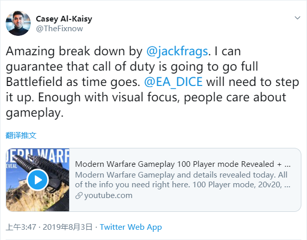 近日《使命召唤:现代战争》的多人模式公布后,前EA全球品牌经理Casey Al-Kaisy在推特上表示,现在《使命召唤》正在朝着《战地》的方向发展,而EA现在则需要考虑改进《战地》的玩法。 根据动视公布的《使命召唤:现代战争》多人模式的情报,新作中的多人模式支持40-100人规模的大型作战,游戏中还能驾驶坦克等各种载具,这些要素像极了EA的《战地》系列。而在Casey Al-Kaisy看了《使命召唤:现代战争》的100人作战的演示后,他表示现在《使命战争》系列正在越来越像《战地》了,而他希望EA不要在过份追求游戏画面了,而是要对《战地》的玩法做出新的改变,现在玩法才是玩家关心的重点。 随着《使命召唤》越来越朝着《战地》的大规模地图和海陆空全面作战的玩法发展,必然会抢占一部分原本的《战地》玩家,所以EA必须要寻求新的突破,找到新的玩法打破这一局面。 |