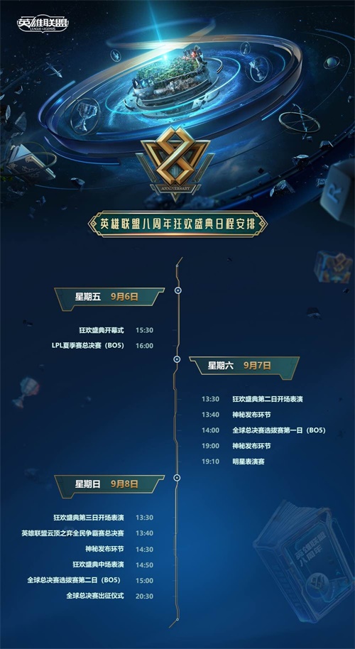 无限可能,无限热爱!自2011年开启国服公测,在各位召唤师的陪伴下,《英雄联盟》将在今年9月迎来八周岁。一直以来,每一年的周年狂欢盛典都是专属于召唤师们的年度盛事,今年,《英雄联盟》八周年狂欢盛典即将于9月6日至9月8日,在上海梅赛德斯-奔驰文化中心举行,活动门票将于今日(8月20日)14点正式开启售卖,点击前往购票>>>(https://lpl.qq.com/es/ticket.shtml?iTicketId=45)。 英雄联盟八周年狂欢盛典 在为期三天的年度狂欢当中,《英雄联盟》将以丰富多彩的活动内容,与各位召唤师一同回顾过往无限热爱中的欢乐与感动,展望未来无限可能中的精彩和期待,共同见证2019LPL夏季赛冠军、三支代表LPL出战2019全球总决赛的队伍、首届云顶之弈全民争霸赛冠军的诞生,同时邀请玩家们一起领略明星表演赛、重磅发布环节等精彩内容! 2019LPL季后赛对阵形势 英雄联盟云顶之弈全民争霸赛 2019英雄联盟八周年狂欢盛典购票详情—— 售票开始时间:8月20日14:00 点击购票>>>(https://lpl.qq.com/es/ticket.shtml?iTicketId=45) 购票限制:每位用户须凭QQ号码及此QQ号码关联的一个20级以上游戏账户进行购票;符合购票条件的QQ号码可在每个庆典日限购两张门票。 温馨提示:本次门票全部为纸质门票,门票仅通过英雄联盟八周年狂欢盛典官方售票网站进行销售。购票成功后,门票将通过快递的方式送达。 上海梅赛德斯-奔驰文化中心 英雄联盟周年狂欢盛典是专属于英雄联盟玩家们的年度庆典活动,自2012年一周年狂欢盛典在上海举办以来,在过去六年时间里,周年狂欢盛典先后走过上海、深圳、广州、北京,南京,逐渐成为最受召唤师关注的年度盛事。如今,八周年狂欢盛典即将回归黄浦江畔,以满满的诚意与广大召唤师相约上海梅赛德斯-奔驰文化中心。 无限可能,无限热爱!9月6日至9月8日,八周年狂欢盛典即将到来,期待与你一起见证更多精彩! |