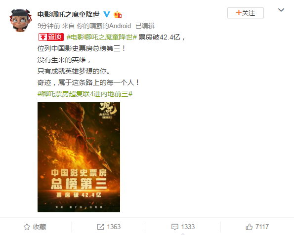 今日(8月21日)《哪吒之魔童降世》官微发文宣布,哪吒票房破42.4亿,位列中国影史票房榜第三位。 《哪吒之魔童降世》票房已超越《复仇者联盟4:终局之战》。排在前面的只有《战狼2》(56.82亿)和《流浪地球》(46.56亿)。 据猫眼数据显示,电影《哪吒之魔童降世》观影总人次达1.06亿,超《流浪地球》 (总人次1.05亿),成为中国内地有数据统计以来,观影人次第二高的电影,观影人次冠军仍由《战狼2》的1.6亿保持。 之前电影《哪吒之魔童降世》联合发行方华夏电影发行公司发布通知称,《哪吒之魔童降世》公映密钥延期,影片将延长上映至9月26日。此外《哪吒之魔童降世》还将于8月23日在澳大利亚上映,于8月29日在新西兰上映。北美上映时间待定。 |