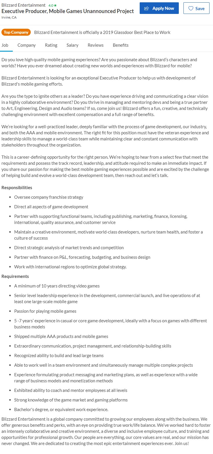 【叶子猪网8月24日讯】暴雪近日发布了多个岗位的招聘需求,包括《守望先锋》高级游戏编剧、负责游戏服务的高级软件工程师(C++)、负责遭遇战设计的设计师,以及一款未公布手游项目的执行制作人。 值得注意的是,手游项目的执行制作人的岗位职责要求颇高,需要有超过10年的游戏行业经验、对3A大作和手游开发都有所了解,能够把握游戏市场和不同平台,以及“对玩手游充满热情(Passion for playing mobile games)”。 |