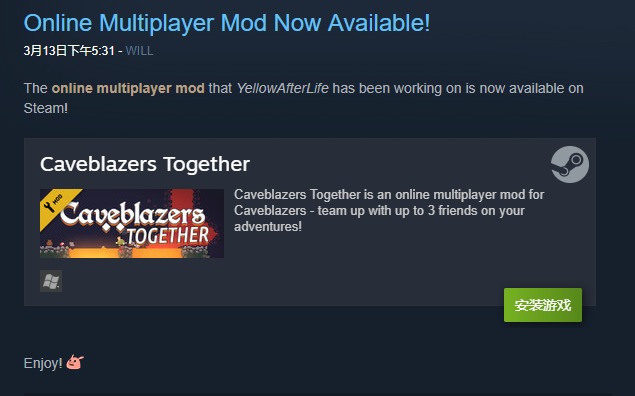 2019年3月13日,《洞窟开拓者》官方宣布本作的“在线多人Mod”已经正式上线了,拥有《洞窟开拓者》游戏的玩家,可以下载本Mod享受到4人的多人游戏体验。据悉,本作的“在线多人Mod”是由社区自制而成。 游戏官方介绍: 洞窟开拓者是一款奇幻设定下的Rogue类平台动作游戏。每一次游戏都是独一无二的体验,玩家可以在随机生成的线性流程关卡中探索大量的物品武器装备。游戏发生在一个最近被发掘的,据说内含“无法想象的力量”的洞窟。你扮演一位即将踏上旅程、探索洞窟、寻觅宝藏的冒险者。然而,你在这里并不孤单……进入洞窟深处后,你将会探索新区域,新武器,还有新怪物。 想要在《洞窟开拓者》游戏中体验四人共同游戏体验的玩家们,可以点击链接进行下载。 游戏截图: |