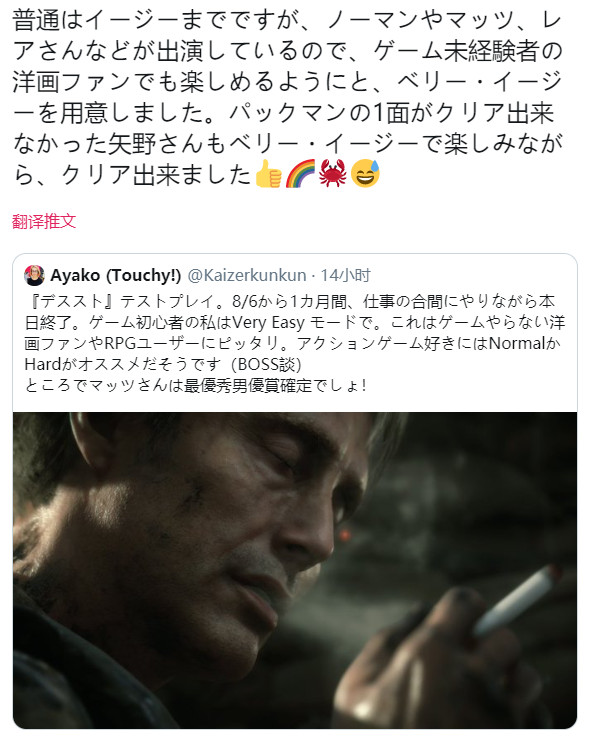 小岛今日在Twitter上确认《死亡搁浅》将有多个难度设置,包括一个“非常容易”的超简单模式。小岛表示在超简单模式下,没有游戏经验的西方粉丝也能享受这款游戏。 “正常来说,难度只会有简单等难度,但考虑到我们有弩哥,拔叔等知名卡司,所以我们准备了非常容易难度,这样那些没有游戏经验的西方粉丝也能享受这款游戏。” 而根据小岛助理Ayako,《死亡搁浅》的超简单模式适合那些不擅长动作游戏和喜欢看剧情的玩家,《死亡搁浅》还会有普通难度和困难难度,这两个难度面向的是喜欢动作游戏爱好者(喜欢打BOSS的玩家)。 顺便她还大赞了“拔叔”麦德斯·米科尔森在游戏中的表演,可以说是“最佳男演员”了。 Ayako表示自己一个月前就开始抽空玩《死亡搁浅》了,昨天终于通关,本作兼具艺术性和娱乐性,对社会性问题也做了一定的探讨。 《死亡搁浅》将于11月8日正式发售,登陆PS4,本作将参加TGS 2019。 |