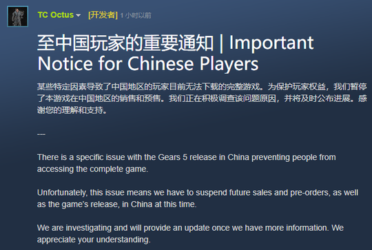 官方回应《战争机器5》下架:因中国玩家无法下载完整游戏