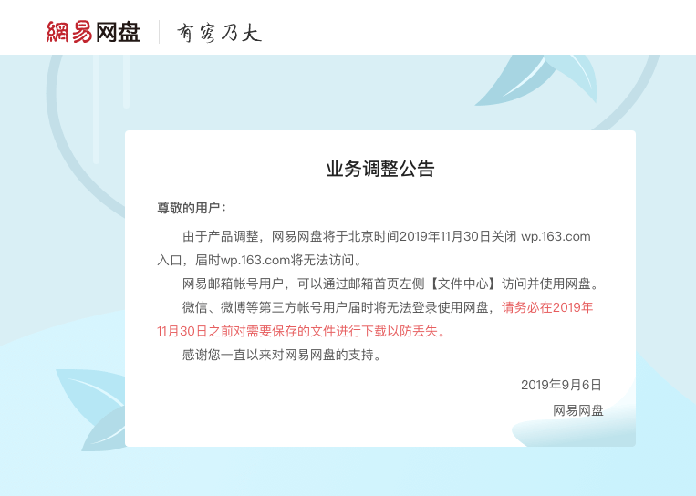 网易网盘将于11月30日正式关闭 第三方账号无法登陆
