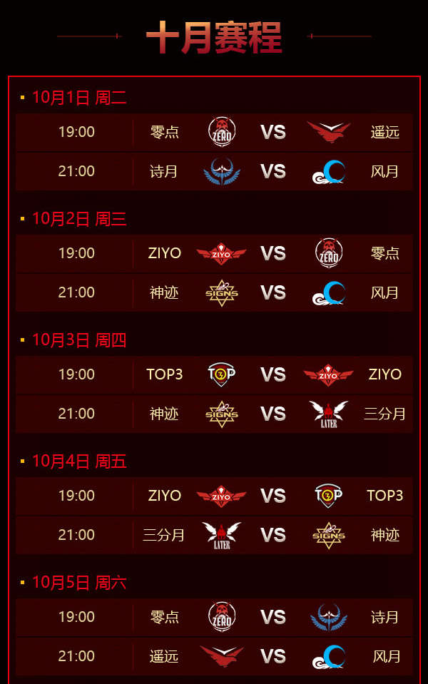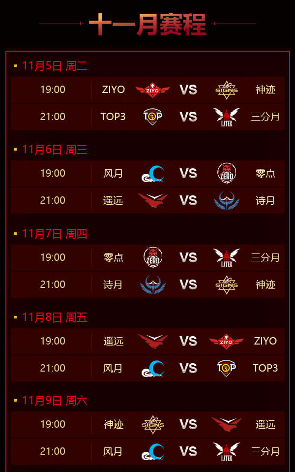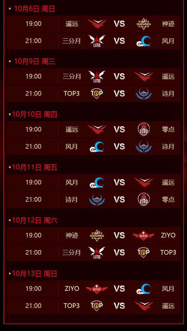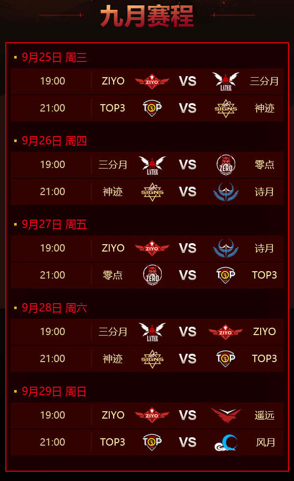 由电魂主办,奥义电竞承办的2019《梦三国2》职业联赛(简称:MPL)秋季赛常规赛赛程于近日公布,常规赛赛程横跨9、10、11三个月,从9月25日开始,8支MPL战队将进行为期五周的比赛。三分月与ZIYO将打响秋季赛的首场比赛,在揭幕战上进行“冠亚大对决”!下面是常规赛的对阵安排: