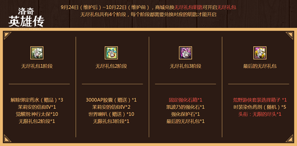 9月24日,《洛奇英雄传》迎来全新版本!羁绊系统倾情上线,与15位角色的有爱互动温馨有趣,虽然此次版本仅开放至亲密度1阶段,但相信随着时间的推移,英雄们可在慢慢地积累之中有所收获哦!那么,此次全新版本中除了羁绊系统、公会房屋更新及换装间2.0时代开启外,还有哪些全新新品及活动呢?今日,让我们一起一探究竟吧! 【2019女神的馈赠VIII】 在9月24日维护后至10月22日维护前,2019女神的馈赠VIII限时掉落,英雄们也可消耗金币从小猫莱伊特别商店中兑换获得哦!本次的2019女神的馈赠VIII之中不仅有全新热门S级时装,还有瓦尔基里翅膀、恐龙套装及红色起源之火选择箱等等惊喜道具哟! 想要入手的英雄不妨等待国庆假期之时再兑换商城中指定的茉莉安的信仰IV,届时还能通过活动收获限量版头衔及额外的茉莉安的信仰IV哦,活动详情还请关注9月30日官网公告。 此次2019女神的馈赠VIII中,最引人注目的当属全新“S级特别版恶魔贵族套装”及“特别版黑精灵恶魔套装”,以黑色光亮皮质为底,红调为缀,浑身配以恶魔元素,邪魅贵气之余还有一些小俏皮哦! 同样身为S级的“暗影女巫套装”及“暗影法师套装”则为独特的暗黑色调,与大部分S级时装闪耀的金光不同,这两款时装浑身散发着黑烟,冷酷之余又添神秘之感。 “瓦尔基里翅膀”在2019女神的馈赠VIII中闪耀着圣洁之光,洁白柔顺的羽毛,并将庞大的羽翼小心收拢至身后,相信有它的存在,你的外观将会多一份英灵的神圣之光哦! A级“狂野恐龙套装”与“可爱恐龙套装”则为2019女神的馈赠VIII中的小可爱,时尚的休闲装扮,或紧身或舒适的现代设计,相信放在现实也是吸睛的存在哦! 【时装合成】 在9月24日维护后至10月22日维护前,英雄们能继续从时装合成之中获得S级“梦魇女王套装”与“獬豸武士套装”,无论是男角色的魁梧之感还是女角色的性感之姿都能完美展现哦! 【经典时装】 又是一年国庆到,在9月24日维护后至10月22日维护前,英雄们可从商城或时装沙龙之中直接兑换A级“女帝与小精灵套装”及“帝王与小精灵套装”。红色凤袍,金龙蟒带,彰显尊贵的地位及身份之时,还有头上呆萌小精灵相伴! 【超值礼包】 在9月24日维护后至10月22日维护前,英雄们可从商城之中兑换“每日加油礼包”及“无尽礼包”!当“无尽礼包”兑换至第四阶段时,还能获得荒野游侠套装选择箱子哦!此外,内含趣味情感表达的“展示魅力情感表达箱子”等你兑换! 为迎接全新版本上线,《洛奇英雄传》还准备了多重福利活动等待英雄们的积极参与哦!不仅有网页活动等你参与,还可于游戏中获得大量大马士革钢铁,还可体验到强化肩章至+15的乐趣哦! 【金秋签到活动】 9月24日至10月20日期间,英雄们每日在线半小时,即可于网页活动“金秋签到活动”获得1次签到机会哟! 【最强声优】 随着羁绊系统的上线,想必不少英雄已经按捺不住自己配音的欲望啦!正好,“角色台词配音大赛”等你参与哦!在9月24日至10月21日期间,英雄们下载台词并选择其中一个角色台词配音,也可以根据游戏背景与角色设定对台词进行再创作,只要参与并审核通过,即可获得茉莉安的信仰IV哦! 【能养成钢铁的花盆活动】 在9月24日维护后至10月15日维护前,每日登录游戏即可获得“神奇花盆”,完成S3普通战役可以获得“肥料块”(每周最多获得21个),可右键将3个“肥料块”制作为一个“钢铁的肥料”,消耗“钢铁的肥料”能开启“神奇花盆”获得1个“萌芽钢铁的花盆”和1个道具奖励。英雄们可将“萌芽钢铁的花盆”交给奇怪的旅行者获得“开出钢铁的花盆”,集齐一定的“开出钢铁的花盆”就能在兑换商店兑换奖励哦! 【肩章强化活动】 在9月24日维护后至10月22日维护前,90级以上的角色登录游戏后可通过邮件获得“勇士的肩章礼包”,完成90级及以上Raid战役,可从战役掉落中获得“勇士的证据(90级)”(每日最多掉落5个),完成95级及以上Raid战役,可从战役掉落中获得“勇士的证据(95级)”(每日最多掉落2个),消耗相应的“勇士的证据”可以强化肩章(必定成功),肩章最高可强化至+15,强化等级越高,肩章所加的属性也会越多哟! 【公会组队活动】 9月24日维护后至10月22日维护前,与公会成员组队进行战役时,即可根据同一队伍中的成员数获得不同的增益效果。 【阿内斯特采集活动】 9月24日维护后至10月22日维护前,“阿内斯特的采集”活动再次开放!70级以上且习得采集技能的角色可使用“采集副本入场券"进行出航! 【火眼金睛活动】 9月24日至10月21日期间,凡寻找和发现游戏内的文本错误(包含错别字,错误的道具描述,容易产生误解的任务说明等),皆可以截图加说明的Word文档形式发送邮件至bulin@tiancity.com。每找到1个错误即可获得茉莉安的信仰 IV*1,每名玩家最多可获得5个。 以上,即为《洛奇英雄传》9月24日新品及多重福利活动啦!新版本惊喜多多,大家一起来探秘吧! |