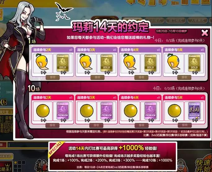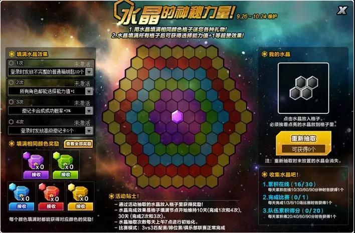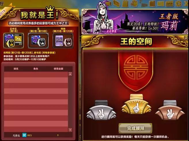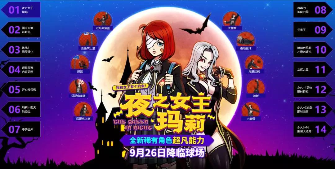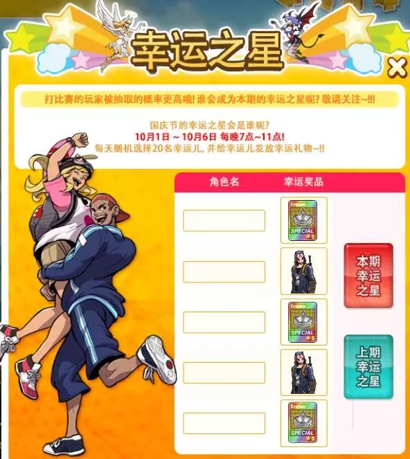 《街头篮球》国庆节版本9月26日正式上线,14大活动引爆国庆狂欢热潮,赶快来和女王一起约会吧!新稀有角色夜之女王-玛莉万众瞩目,无限强化第二弹来袭,全新活动水晶的神秘力量,接下来让我们一起抢先了解一下新版本内容! 【14大活动引爆国庆新版本】 活动1:夜之女王降临 玩家可在活动界面或商城购买“红色贡品”。抽取道具时会获得“女王的宠爱”个数,用于兑换道具。每个蜡烛解封度到达100%时,会赠送额外福利效果。每个蜡烛的封印有两层,三个蜡烛的第一层封印全部解除后才可以解除第二层。 道具抽取有概率获得新角色:夜之女王-玛莉、五星精锐队伍徽记卡等珍稀道具。 活动2:国庆充值送好礼 充值达到1500点即可获得服装果实(5个) 充值达到6800点即可获得三国徽记卡(1张) 充值达到16800点即可获得永久技能槽(1个) 充值达到26800点即可获得虎娃娃(白色,30天,自选属性+3) 充值达到56800点即可获得4星特殊精锐队伍徽记卡一张 充值达到86800点即可获得毛皮披肩(白色,60天,自选属性+3) 以上奖励只可获得一次! 活动3:挑战!无限强化 点击强化按钮,会通过消耗燃料强化该道具,不同强化等级消耗染料不同。强化成功提升强化等级时,根据强化等级可以获得对应的使用时间或者道具能力值。强化中的道具可以通过点击“接收道具”按钮接收该道具。(等级0的道具无法接收)强化失败时会降低或者初始化强化等级。(初始化时即强化等级归0)接收后的道具在帐号转送中选择能力值。 +10等级的道具会变为特效/动作道具。 活动4:道具图鉴更新 道具图鉴新增两套收藏: 萌喵套装(发型)+萌喵套装(上衣)+萌喵套装(下衣)+萌喵套装(鞋子)全部登记后可以领取道具:萌喵眼镜(女,永久,自选+3) 星屿套装(发型)+星屿套装(上衣)+星屿套装(下衣)+星屿套装(鞋子)全部登记后可以领取道具:潮流墨镜(男,永久,自选+3) 注:时限道具也可以登记图鉴中的道具! 活动5:开心摇号机 完成正常结算的3V3匹配赛/排位赛/俱乐部联赛后获得摇号次数。摇出的每个玻璃球上都有数字。可以获得玻璃球上数字的对应奖励。摇到一次的数字不会再次出现。获得所有奖励后,奖励会重置,完成三次后奖励不再刷新。 活动6:玛莉十四天的约定 每完成一场比赛可以获得额外经验值,完成场次越多奖励越丰富。 每天完成一场:+100%经验值,完成两场:+200%经验......完成10场:+1000% 每日21点~23点进行的正常结算的3V3匹配赛、排位赛或者俱乐部联赛 活动7:守护金库 只要连续登录4天,第5天登陆时可以获得金库里的所有礼物。如果次日没有登录,礼物会被夺走,所以请一定要来哟。(登录以每日上午7点为准) 活动8:水晶的神秘力量 通过活动获得的水晶放入格子里获得奖励。填满水晶获得的效果是格子填满节点开始维持十天(一次和四次奖励)和三十天(二次和三次奖励)。水晶抽取次数每日上午7点初始化。 活动9:我是王 活动期间使用点券最多的玩家成为王中之王!活动期间使用点券至少1次以上。代金券消费不计算在本活动中。本次赠送礼物给他人的消费不计入我是王活动。 活动结束后,前二十名可获得限定角色:王者版玛莉。(活动结束后首次进入游戏发放) 活动结束后,前三名可获得活动限定特殊套装: 万圣节纪念装饰耳环(女,永久,无属性) 万圣节纪念装饰项链(女,永久,无属性) 万圣节纪念装饰南瓜(女,永久,无属性) 活动10:新角色(玛莉)冲级送好礼 活动期间内创建新稀有角色:夜之女王-玛莉,并且等级达到46级以上(包括46级)可以获得道具趴熊(永久,弹跳+3)。活动道具在活动结束后统一发放至玛莉的角色礼物盒内。 活动11:幸运之星 每天随机选择20名幸运儿,并给幸运儿发送礼物。打比赛的玩家被抽取的概率更高哦。 活动12:永久+1装饰限时特卖 活动13:永久+2发型,发型能力加强包双重出击 活动14:永久Lv16服装大抢购 最后,祝祖国70周年生日快乐!《街头篮球》国庆节全新版本9月26日正式上线,永久+2发型限时出售,挑战无限强化,新角色冲级送好礼,守护金库,幸运之星,国庆乐翻天,我们在球场上等你来战! 《街头篮球》职业联赛专题:http://www.fsjoy.com/FSPL/ 《街头篮球》官方微博:http://weibo.com/fsjoy 《街头篮球》官方微信:fsjoy2013 |