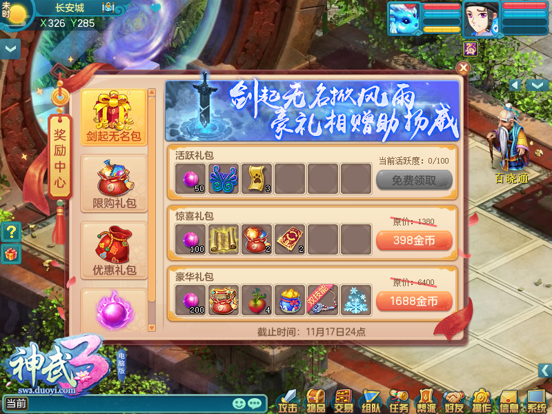 剑起无名,神兵降世!《神武3》电脑版2019下半年全新内容“剑起无名”携同名新服今日燃情上线,140级装备、新·异界魔宫、岁星生肖、特色全服活动、战斗平衡调整等一系列重磅内容次第登场,顶级战斗格局即将迎来全面革新,更丰富、更多样、更具趣味性与观赏性的回合策略博弈花式解锁,还有内含可自由选择通灵符/卸灵符的如意礼袋、双技能银河加护、固神丹礼包以及雪花足迹等稀有道具的“剑起无名”礼包福利登场,精彩内容期待每一位三界少侠前来体验! 全新内容“剑起无名”今日上线 140级装备激燃出世 冰晶为本,灵鹤为形!《神武3》电脑版全新内容“剑起无名”今日正式开测,全新140级装备随之登场,男用武器“鹤韵”、女用武器“冰晶”、男女装备“冰魄”三大系列横空出世,以“鹤+冰晶”为主题的统一外观设计,给人一种超凡脱俗的浩渺意境,而冰晶环绕、灵鹤飞舞、寒气四溢的炫酷动态特效,更体现了全新等级装备的王者风范。 130级全新副本领衔 异界魔宫岁星生肖等新玩法陆续登场 在上线140级装备的同时,全新内容“剑起无名”还将陆续推出130级同名副本、新·异界魔宫、岁星生肖、降魔军团等一系列新玩法,趣味玩法、丰厚奖励,让每一位少侠都能尽情享受全新内容“剑起无名”带来的无尽乐趣。 剑起无名:拯救神兵铸造师无名老者 少侠们应云歌请求寻找仙草救治其“鹤韵”、“晶心”系列武器缔造者“无名老者”,并前往化外之境寻找铸造材料、重现真实鹤舞以助无名老者打造神兵。而后无名老者入谷醉心造籍,数日不眠不休,尽管招致心魔侵体,但最终仍是制成神兵九柄。 如何寻找仙草帮助无名老者?在寻找冰晶鹤舞的过程中,有哪些问题亟需解决?化外之境究竟位于何处?“虎啸龙吟”怪象又是什么生物在作祟?130级全新副本“剑起无名”9月30日全服上线,诸多奥秘即将为你揭晓! 岁星生肖:高难度强趣味性战斗等待挑战 新挑战来袭!《神武3》电脑版“剑起无名”推出了难度更高的“岁星生肖”玩法——岁星生肖乃镇守太岁星辰之神将,在天庭中战无不胜,无往不利,听闻三界豪杰锋芒毕露,故奉玉帝之命下凡,意图挫其锋芒。 十二生肖刷新后,如果在下小时20分前内被全部击杀,则下小时刷新十二生肖时,将有一定概率额外刷新一只岁星生肖,岁星生肖出现时,地图上也将刷新两只各具特色的全新NPC守卫在它旁边,并使用配合主怪门派特色的全新技能进行防守、进攻。击败后有几率获得精灵之心、符石碎片包等丰厚奖励! 其中,天策守卫会清除主怪的横扫虚弱状态,万兽岭守卫会为主怪附加状态使其飞击两次,东海龙宫守卫会随机标记三个玩家单位使其进入水土虚弱状态。不同守卫的全新技能,将为岁星生肖战斗增添更多挑战乐趣,相信《神武3》电脑版将再次掀起全服观战生肖的热潮。 新·异界魔宫:轻松探索迷宫收集宝物 剧情玩法丰富、灵宝众多的“异界魔宫”重置后将于10月上线,新地图、新玩法、新挑战!江湖第一情报组织风门最近发现了一座神秘的异界魔宫,其中藏宝无数却又凶险异常。几番损兵折将之后,风门长老决定邀请天下英雄共同探索迷宫,不知少侠你是否有兴趣参与其中? 新·异界魔宫不仅采用全新美术资源重新设计了魔宫地图,并同步取消了房间的概念,方便玩家们以更开阔的视野进行探索寻宝。在优化已有事件的并同时增加了新的趣味事件,各位少侠有几率触发“剑起无名”相关任务,探索第九柄神兵的秘密!此外,新·异界魔宫还增加了全新BOSS挑战,各队伍收集灵宝即可使其现身,期间还有几率触发相应成就,迷宫探险乐趣更足。 降魔军团:风之阵雨之阵解锁 《神武3》电脑版“降魔军团”迎来新的挑战层数,上线后各大帮派可率先挑战3-7层,后续最高可挑战至9层。在一定时间内通关低层降魔,下次挑战则可以选择更高层数,层数越高,事件和奖励将会越多,穷奇的能力也将增强,战斗中还会出现饕餮、梼杌等凶兽。同时,探索迷阵时新增小地图显示并优化相关细节,便于帮派成员深入大阵,解除封印,降伏妖魔! 新装备解锁活动全服开放 第九柄神兵即将揭开神秘面纱 全新内容“剑起无名”9月27日上线后,所有等级段的玩家在进行挖宝时,都有一定概率触发特殊事件,并将于下一个整点在长安城刷出“鹤韵”、“晶心”系列神兵的缔造者“无名老者”,触发该事件的少侠将获得各服务器的唯一称谓“一铲定乾坤”。 无名老者出现后,三界少侠可以通过封妖、抓鬼、野外战斗三种途径获得全新道具“图谱残章”,使用图谱后不仅能获得经验信誉奖励还可以为全服的武器图谱解锁进度。图谱共有九章,每解锁一章,该服务器所有玩家都能获得一定奖励。活动期间,各城镇有几率出现神秘鬼差搜寻无名老者,少侠们联手将其成功驱赶也可以增加进度获得奖励。 其中,图谱第8章解锁完成后,继续提交图谱残章将无法继续增加进度,悬而未决的第9章图谱隐藏着传说中从未现世的第九柄神兵的寻找线索,鼠标悬停其上,将会有更多关于该武器的指引。第九柄神兵是否真正存在,又在何人之手,更多彩蛋等你来发掘! 新服回流福利来袭 助力踏上新征程 重出江湖,全新旅途。《神武3》电脑版“回归新服”活动再次开启,老玩家回归选择更自由!9月27日-12月6日期间,若同账号下有≥60级的角色,且该账号在9月13日0点后未登陆过,则账号符合新