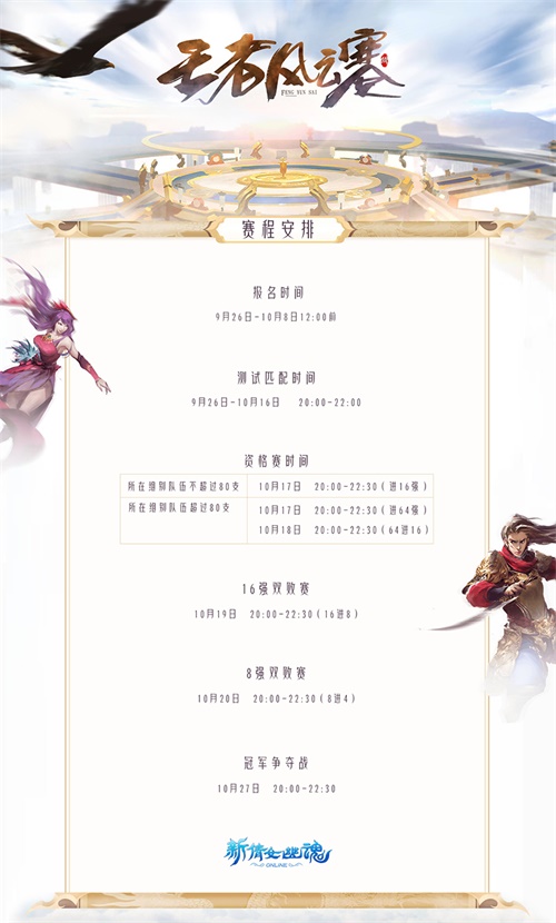 激战王者风云,赢取绝美专属!网易第一玄幻网游《新倩女幽魂》2019年度王者风云赛已经开启报名阶段以及测试匹配阶段,欢迎全服各等级段的少侠报名参赛! 十六强胜者的绝美专属奖励曝光,丰富好礼等待赢取,快来参与王者风云赛,争夺最终大奖! 王者激战,风云再起 分组竞赛,角逐最终十六强 2019年9月26日维护后—2019年10月8日12:00,转服一至转服六的服务器等级大于50级玩家可前往四大主城太乙子处点击“创建和申请战队”创建战队报名参赛。 本届王者风云赛共分为新锐组、英武组、神勇组、天罡组、天元组五个组别。 报名参加的队伍将在各自组别参加资格赛,资格赛每天共分为五轮,每轮随机匹配一个对手,5轮后根据各支战队的获胜数、积分、击杀数、总用时进行排名,排名靠前的16支战队将进入正赛。 通过资格赛选拔的16支队伍将会师双败淘汰赛,决出最后的8强、4强以及冠亚军席位。 王者风云赛赛程表 元宝分红,绝美专属等你来赢 参与本次擂鼓助威玩法,擂鼓助威册和擂鼓助威礼盒所得元宝将作为赛事元宝分红奖池,截止到10月23日23:59,将确认各组别冠亚季殿战队元宝分红数额。 最终进入16强的获胜队员都将获得相对应的不同时效的绝美专属奖励,包括专属属性时装· 祁山锦、专属属性头饰、专属特效称号、专属属性法器、专属头像框等。 专属属性时装· 祁山锦 专属属性头饰,华贵潇洒 冠军专属特效称号·展步登高临极巅 专属属性法器,灵动精巧 专属头像框,与众不同 王者风云起,激战赢好礼!了解更多最新资讯,关注《新倩女幽魂》官网,更多精彩等你来发现!快和我们一同开启玄幻的三界之旅吧! |