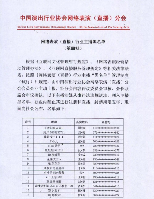 10月8日,为了整顿直播行业乱象,中国演出行业协会按照《网络表演(直播)行业主播“黑名单”管理制度(试行)》,审核后封禁了42名主播,封禁期限五年,五年内行业内禁止其进行注册和直播。 在公布名单上,可以看到有ID为“王者归来方为王”、“666虐我”、“廣州亮少”等主播,这部分主播都是在直播过程中涉及宣扬色情、赌博,涉嫌从事违规违法活动。 其中,这个ID“廣州亮少”的主播,网友指出是传说中那个喜欢编造自己谣言的广州亮少,比如自己的父母生病了什么等等谣言,跟喜欢编造别人谣言的闪电战小猪,都是吃瓜群众集体吐槽的主播。 2018年4月份,第三批网络主播封禁黑名单中,因为有“乔碧萝殿下”、“红花会贝贝”而备受玩家关注,同样也是封禁5年。目前上榜黑名单的主播已有164名,包括“五五开卢本伟”、“MC天佑”等知名度较高的主播。 在“42名主播被封禁5年”热搜下,网友也发表了自己的看法,比如“让你想着红,这下黄了吧,封得好”、“干得漂亮”、“支持支持,主播就应该积极向上”、“都是什么网红”、“为什么没有快手那群卖东西的?”的等等,基本上都是点赞支持的评论言论。 可见网友对于互联网直播行业的监管非常重视,都希望各种乱象能得到有效的监管和监督,净化网络环境。 游戏主播、秀场主播等直播行业中,没有遵守直播规则、违背道德底线,甚至有违法违规行为的主播,对观看直播的未成年人会造成错误引导,低俗的内容造成极恶劣的社会影响。希望直播平台都能加强监管力度,主播们都能自查自律,不要消费粉丝。 |