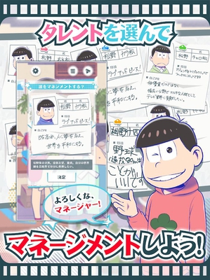 《阿松的尼特艺能事务所!》是改编自人气动漫《阿松》的育成文字冒险手机游戏,玩家将会扮演经理人,将阿松六子脱离尼特族,陪育成为完美的明星在艺能界出道!