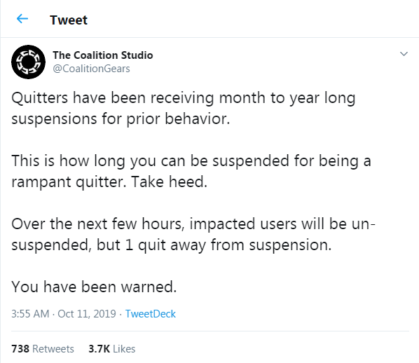 之前我们报道过“突遭重罚!《战争机器5》一玩家因屡次早退被封两年”这则资讯,国外一个《战争机器5》玩家在21场比赛中退掉了18场,严重影响其他玩家体验,被官方封禁640天。近日《战争机器5》官方在推特上发文称,他们已将所有被封的玩家解封,并将采取新的惩罚措施。 官方表示因为之前的强退行为,违规者已受到被封禁一个月到一年时间的惩罚,现在那些因强退而受到影响的账号将被解禁,官方会根据玩家强退的时长来决定封禁时间。他们已经警告了那些违规者。 《战争机器5》微软交流主管Dana Sissons表示,如果玩家因网络问题而导致连接中断,及时重新连接回归游戏,是不会受到强退惩罚的。 《战争机器5》已登陆Xbox One和PC平台,游戏支持简体中文。 |