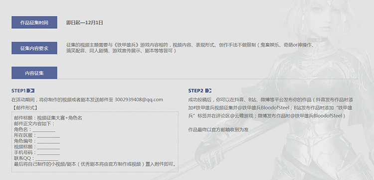 即日起至12月1日,冷兵器军团对抗公平竞技网游《铁甲雄兵》视频征召令开始了,面向所有玩家以及视频制作者们征集精彩镜头!活动参与无门槛,视频形式无限制,只要投稿“铁甲雄兵”主题原创视频,即可参与到活动中来,更有万元现金大奖等你来赢取!精彩由你导演,记录美好瞬间,活动现在才刚刚开启,你还在等什么! 视频征集活动:https://bos.ycgame.com/act/19directer/index.html 【秀出你的创意 精彩由你导演】 铁甲雄兵视频征集大赛火热进行中,这也是让各位玩家一展神通、秀出创意的好机会。将作品上传至官方指定邮箱,并在邮件中填写相关信息就算是投稿成功。通过让人惊叹的剪辑技巧展现恢弘冷兵器战场,或者是加入令人捧腹的方言配音,又或者是魔性的鬼畜娱乐.....无论你的表现形式如何,只要你的创意够精彩就可以为你的作品加分! 除了视频以外,精彩的游戏剧本同样也是可以参加征集活动。优秀的剧情脚本还将由官方组织制作成为视频,让其他玩家都可以欣赏到你的作品! 【创意不封顶 奖金无上限】 创意不封顶,奖金无上限!铁甲雄兵也为所有参赛选手准备了丰厚的奖励回报。所有投稿并通过初审的玩家,都可以获得参与奖,奖励为100元京东卡。另外在第二轮评选中还将分别设有一等奖、二等奖、三等奖以及优秀奖,都将获得与之对应的现金奖励,最高奖励为2000元! 最最重要的是,本次活动为了鼓励参赛玩家,所有奖项不设名额限制,只要你所投稿每一部的作品质量够好,都可以重复获得活动奖励! 《铁甲雄兵》视频征集大赛火热进行中,精彩视频由你导演,即刻投稿参赛,秀出创意与风采,赢取万元赛事奖励!更多游戏详情请见游戏官网:https://bos.ycgame.com/ 关于【铁甲雄兵】 《铁甲雄兵》是云蟾游戏历时多年潜心自主研发的一款冷兵器军团对抗公平竞技网游。游戏秉承着以匠心致初心精神,致力为玩家们打造一个绝对公平的竞技环境。游戏采用自主研发的Evolution引擎,为玩家们提供了一个波澜壮阔的融合中西 方文化的冷兵器战场。玩家在战场中将扮演统兵作战的将领,率领军团纵横沙场、攻城略地,在战火中感受真刀真枪的厮杀,体验原汁原味的战场氛围。 |