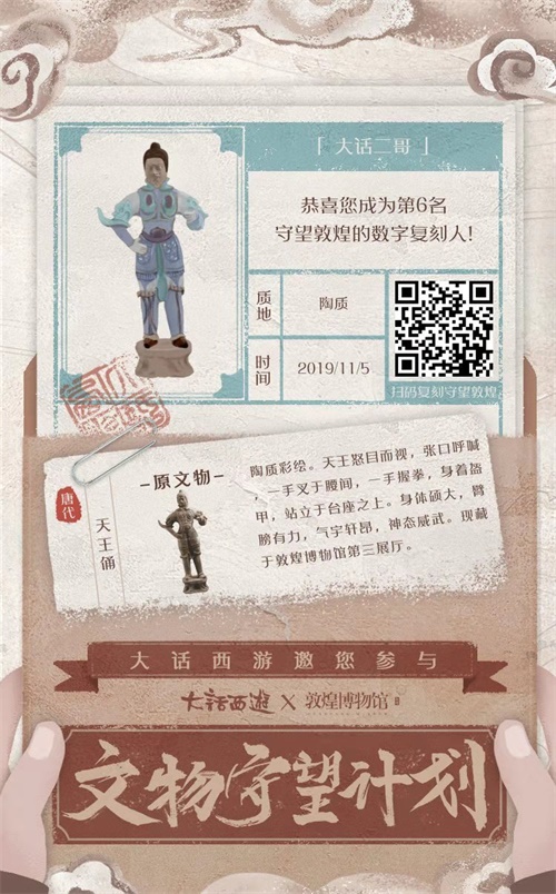 敦煌壁画,炫丽夺目,虽然在石窟之中,古老的东方色彩经历千年而逐渐消逝,但这一次在现代科技下,将重新焕发光彩。大话西游“国风复兴计划”2019再次翻开新篇章,携手千年敦煌,将用数字形式记录敦煌文物的缤纷重彩。今日大话×敦煌 “文物守望计划”H5正式上线,邀你一同为文物上色,重现敦煌古物风华,传承东方色彩的独特之美! 复刻文物 赋彩敦煌 敦煌珍宝,述古谏今,厚载千年传奇。打开H5,映入眼帘的是数字化的敦煌博物馆,一场与敦煌文物亲密接触的邂逅正等待着大家。大话与敦煌,精选了铜镜、陶勇、画砖三个类别的文物,大家可以了解每一件文物的特色和底蕴,并选择复刻文物亲手为其上色。三种文物,各具遗风,大家助它们重焕风采后,更可以将自己的“大作”保存并分享,邀请朋友一起复刻文物为敦煌赋彩,更有机会获得“敦煌文创礼盒”丰厚奖励喔! 文创周边 等你来拿 参与H5互动,除了能够从中感受敦煌传承千年的东方色彩,成为守护敦煌的文物复刻家,还有丰富奖励等着大家。即日起至11月15日,大家只需将自己的复刻作品截图,分享到朋友圈,并点击下列活动参与链接上传截图,就能参与活动抽奖。全套限量版大话x敦煌联合文创周边抢先可得,神秘文创将给你无限惊喜!快扫码参与,一起守护敦煌文物,分享大话游戏里的东方颜色吧! 活动参与链接:http://163.fm/2qCCAAI4 扫码进入大话文物复刻室: 本次大话西游X敦煌博物馆合作,还将上映守望敦煌纪录片,并推出定制门票与系列文创周边,游戏内也将全服上线“敦煌情缘”等一系列深度玩法。众多精彩内容与丰厚福利,即将陆续与大家见面,敬请期待! 关于大话西游X敦煌博物馆合作 丝路中国,大话敦煌。2019,大话西游“国风复兴计划”再启新篇,让黯淡的文物重现光彩,为传统文化再添色泽,大话携手敦煌博物馆带你感受独具魅力的东方色彩!敦煌博物馆是弘扬敦煌文化、展示敦煌古代文明的重要窗口,也是敦煌学又一个重要的研究基地。敦煌博物馆拥有藏品文物10000余件,记录了自两汉至今共三四千年的敦煌先民生活,留存了敦煌的繁盛。 《大话西游2经典版》,国风经典,亿万口碑扛鼎之作!官网:http://xy2.163.com/ 《大话西游2免费版》,绿色免费,情义江湖,经典再临!官网:http://dh2.163.com/ 《大话西游2口袋版》,满分经典,指尖还原!官网:http://xy2.163.com/koudai/ |