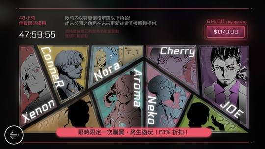 限时角色组合包特价包含即将出现的全新角色 《Cytus II》上市至今推出共 12 位角色,皆各具不同的乐曲特色。为了让玩家能在接近 3.0版本前,能够更加完整体会游戏的原创故事,本次更新推出角色组合包特价。玩家可在限定时间内,于游戏中一次购买 9 位付费角色,包含现有 7 位付费角色及未来即将推出的全新 2 位角色。