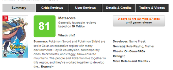 《宝可梦:剑/盾》(Pokémon Sword / Shield)将于11月15日登陆Switch平台,在Metacritic上有19家媒体评分,平均分81分,被誉为“宝可梦系列最佳”。而《死亡搁浅》11月8日在日本首发,首周销量已经突破18万,Fami通满分好评,称其为“日本世代游戏中最好的新IP”。