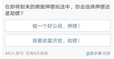 在即将到来的跨服押镖玩法中,你会选择押镖还是劫镖呢? 跨服押镖是逆水寒即将推出的一种PVP玩法,玩家可以通过扮演押镖的镖师和劫镖的匪徒两种角色,在特定的场景中组队PK,赢取收益。 而逆水寒在昨天曝光了对于游戏中即将到来的跨服押镖的一些细节玩法后,关于劫镖一夜暴富的话题就在玩家论坛中热度不散!究其原因,主要还是因为在这次披露的玩法细节中,大家发现,这个玩法的收益简直太太太太太丰厚了! 据官方表示,该玩法相较原本押镖玩法,只增加奖励,不增加肝度,押镖/劫镖都有机会一夜暴富! 选择押镖,无论是护送完好的镖车行至终点,亦或是车被他人打劫,收益都将高于本服押镖玩法;若玩家护送的是高级镖车,奖励更是丰厚。同时,跨服押/劫镖与原本的押镖玩法共享次数限制,不需要花额外的时间来完成! 收益多了还不用肝!这种好事难怪玩家都兴致勃勃的表示:我要抢的他们倾家荡产! 这就有玩家担心了:“那像我们这种咸鱼党怎么办呢?” 官方也充分考虑到了这种情况,如果镖车在途中不幸被劫镖者击破,则劫镖成功。但护镖者也不必担心,即使镖车被击破,请继续押送至终点,也可获得大部分奖励,且必定高于本服押镖的奖励。 而且官方还大方的表示,不论是选择押镖还是劫镖,都可以解锁超豪华的奖励,除了常规的交子收益和装备之外,还可以随机开出神秘新装备、甚至是全新的红发!还是不绑定的那种! 按照逆水寒中随随便便一个稀有发型都要四位数的市场价格来算,这确实是真 · 一夜暴富,难怪玩家都纷纷表示:“实在太香了!” 目前跨服押镖玩法将于本周游戏更新后,在部分服务器投放测试,押镖还是劫镖?勤劳致富还是为非作歹?你想好了吗? |