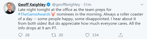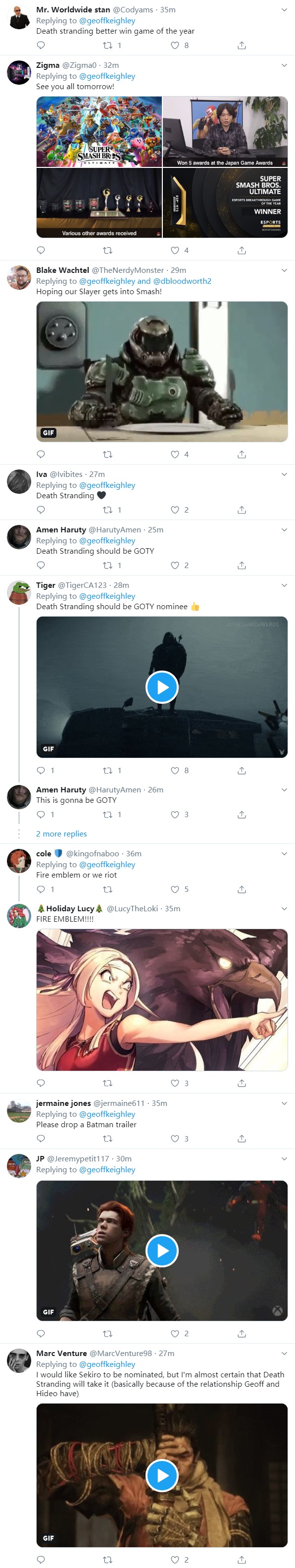 今天(11月19日)TGA(The Game Awards)的创始人 Geoff Keighley 在 Twitter 上表示,他们团队已经为即将于第二天早晨9点(北京时间明天凌晨1点)公开的 TGA 各奖项候选名单忙至深夜——有人欢喜有人愁,同时评论区的玩家们也说出了自己认为的年度游戏,大家心中的年度游戏又是哪款呢? Geoff Keighley 推文: 今晚直到深夜我们还在办公室,因为团队正在为早上的 TGA 提名名单做准备。每一天都像坐过山车一样——有人欢喜有人愁。我倾听了他们每一方的意见!但同时我们还要感谢每个人如此多的关心。所有的信息将在太平洋时间早上9点公开。 从下面的评论区可以看到,大部分玩家心中的年度游戏都是小岛秀夫的新作品《死亡搁浅》以及任天堂推出的格斗游戏《任天堂全明星大乱斗特别版》,当然像今年的大热作品《火焰纹章:风花雪月》、《只狼:影逝二度》等等也没有被忘记,玩家们也非常希望这些佳作能进入到年度游戏的角逐当中。 TGA 2019游戏颁奖典礼将于12月12日在美国洛杉矶的微软中心举办,届时今年发布的各款热门大作都将参与到角逐当中,此外还有非常多游戏新作公开,届时玩家们不要错过我们的跟进报道。 |