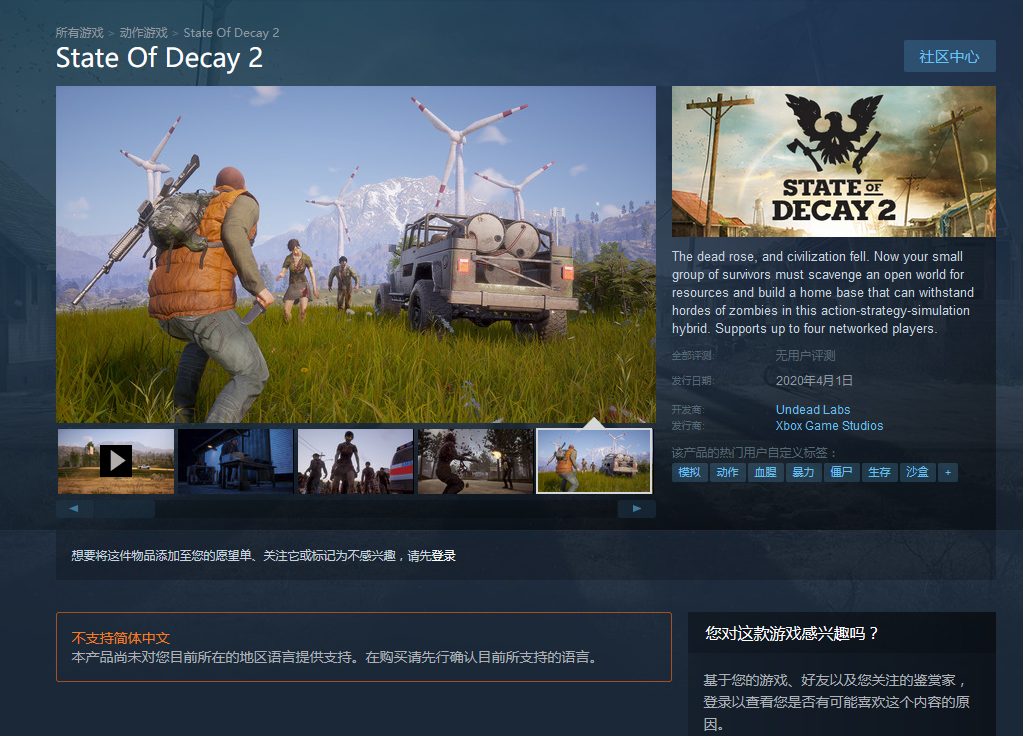 根据最新消息,开放世界第三人称射击游戏《腐烂国度2》将于2020年4月1日登陆Steam平台,目前该游戏已经上架Steam商城页面,一起来了解一下。 Steam《腐烂国度2》商店页面截图: 《腐烂国度2》是一款由Undead Labs开发的开放世界第三人称射击游戏,2018年5月22日在PC/Xbox One平台发售。游戏支持四人在线联机游玩,在开放世界中一边与丧尸展开战斗,一边收集资源建立起生存者基地努力生存并保卫家园,通过行动和抉择获得活下去的权利。根据玩家不同的选择,游戏剧情的发展也会不一样。 值得一提的是,Steam《腐烂国度2》需要第三方账户“Xbox Live”,与此同时,它还是一款跨平台联机游戏。 《腐烂国度2》将于2020年4月1日登陆Steam平台,目前游戏的Steam页面已经开启,暂不支持中文。 |