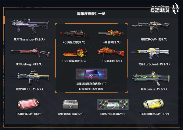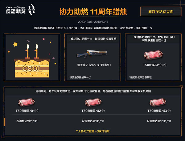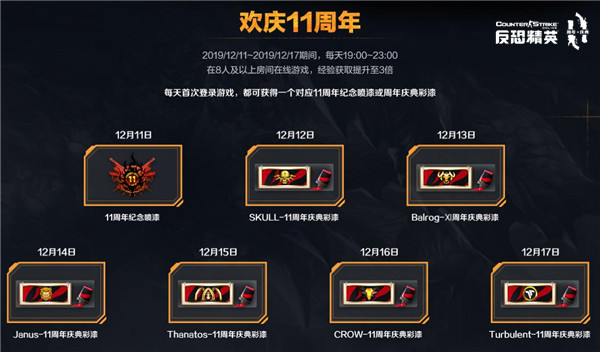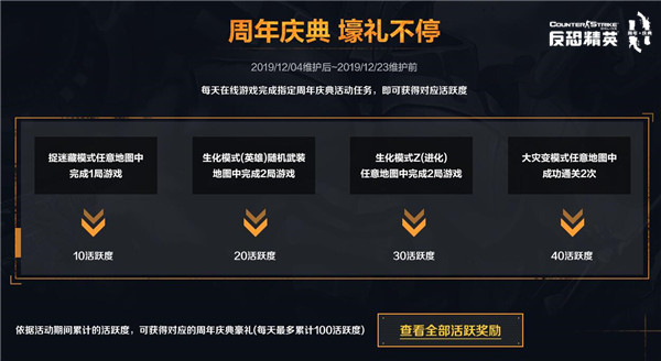 12月16日,FPS经典网游《反恐精英Online》即将陪伴大家走过第十一个年头。在这样一个狂欢的节日里,当然少不了各种喜闻乐见的福利啦!12月4日开始,一大波精彩游戏活动抢先跟大家见面了,快来看看都有哪些好东西吧! 每天登录 领11周年纪念喷漆&彩漆 活动时间:12月11日~12月17日 活动期间,每天19:00~23:00在8人及以上房间进行游戏,经验获取提升至3倍哦!每天首次登录游戏,都可获得一份专门为11周年而特别设计的专属纪念喷漆或周年庆典彩漆1份。需要注意的是,每天登录领取的彩漆是全然不同的,想要全部收藏的朋友最好定个闹钟,免得因为错过而感到遗憾哦! 周年庆典 免费放送 活动时间:12月14日~12月16日 活动期间,每晚19:00~23:00,50余款超凡霸主年神及稀有武器全部免费使用。其中包括了憾宇碎星、【弑神】双剑、【天龙】M3、粉碎者X-12等各种强力年神&霸主武器,让你无论在生化、灾变,还是团战、竞技都能有很好的游戏体验! 周年庆典 壕礼不停 活动时间:12月04日~12月23日 活动期间,每天在游戏内完成指定的周年庆典活动任务,即可获得对应活跃度。依据活动期间累计的活跃度,可以分别解锁大量的高价值游戏道具哦!不仅各种高价值芯片及永久武器拿不停,更可以获得三重进阶强化自选箱,选择获取3款+6永久武器哦! 协力助燃 11周年蜡烛 活动时间:12月6日~12月17日 活动期间,玩家前一日在线游戏达到10分钟以上,第二天可前往活动页面点燃蜡烛。祝福成功1次即可直接领取1把11周年庆典彩漆涂装武器。当个人祝福次数及所有玩家的总祝福值达到指定要求,还可解锁不同的道具奖励哦。 周年武器 限时强化 活动时间:12月04日~12月23日 活动期间, 11周年庆典彩漆涂装武器全部限时强化至超凡武器级别。该系列武器可通过各种周年活动永久获得哦!大家赶紧到游戏中好好体验一番周年武器的魅力吧! 以上便是12月4日《反恐精英Online》上线的11周年最新福利活动了。是不是非常丰富给力呢?要知道,11周年的惊喜还远不止这些哦,让我们一起期待吧! 12月04日 |