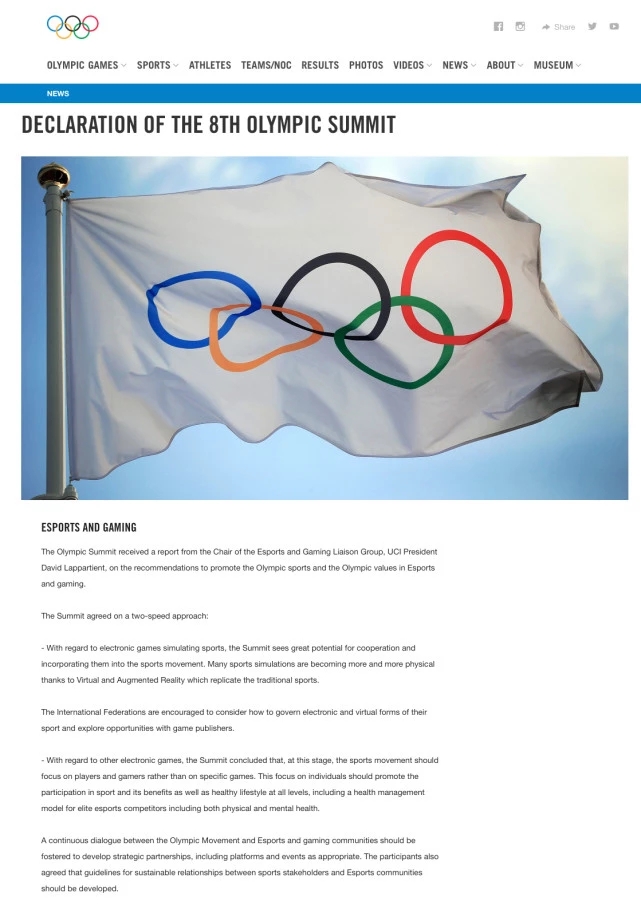 2019年12月8日,晚10点12分,新华网更新了《奥林匹克峰会建议国际体育组织两路并进探索电竞“蓝海”》的资讯。第八届奥林匹克峰会是在本月5日至6日在瑞士洛桑举行的,国际奥委会主席巴赫、副主席于再清,各国奥委会负责人以及国际足联、国际泳联等国际体育组织的负责人参加了会议。 这次会议上一共讨论了七个议题,而电子竞技是由国际自行车联盟主席戴维·拉帕蒂恩特提交,并最终写入会议声明的一项议题。从新华网的资讯,我们可以看到,奥林匹克峰会的与会者给出了自己关于电竞的“新方向”。 第一点是考虑如何管理他们的电子、虚拟形式的体育运动,探索与游戏出版商合作的机会。对于模拟体育项目来讲,以后国际体育组织和各大项目的厂商可能会展开更直接的对话,这也是峰会给出的重要建议。 第二点是考虑打造体育利益相关者和电子竞技社区之间的对话平台。简而言之,从国际奥委会的角度来讲,需要有一个合适的国际体育组织来真正沟通庞大的电子竞技社区,对话平台可能将会成为未来一段时间非常值得讨论和关注的热点。 在国际奥委会官网也更新了与新华网报道一致的声明。