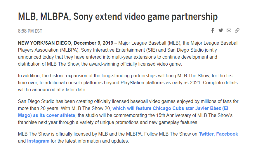 《MLB美国职棒大联盟》系列(《MLB The Show》一直是索尼平台独占,长达足足20年。而今日《MLB》官方推特突然发推,表示和索尼达成了全新的游戏合作协议,正式宣布游戏将会在2021年脱离PS独占,登录微软Xbox和任天堂Switch。 根据官方的通告,这是由美国职棒、SIE和负责开发的圣地亚哥工作室三方共同做出的决定,会在2021年登陆PS之外的平台。虽然公告中没有明说,但是事后美国任天堂和Xbox主管官方推特的转发说明了一切。 这意味着身为索尼一方工作室的圣地亚哥工作室,将会为Xbox和NS开发游戏……因此这个毫无预兆的官宣也是令不少国外粉丝和业内人士大吃一惊,纷纷表示次世代临近业界风云变幻莫测。 然而对于《MLB》系列玩家来说,想要在软任平台上玩上手,还得等个一年半载。官方仅仅透露称会在2021尽早完成新平台游戏的开发,但是具体细节还得等日后发布。 |