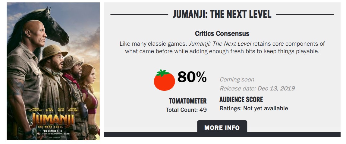 《勇敢者游戏2:再战巅峰》已于12月6日在国内上映,将于12月13日在北美上映。今日(12月11日),IGN为《勇敢者游戏2:再战巅峰》打出7.5分,并表示《勇敢者游戏2:再战巅峰》在把每个角色打回到游戏世界之前,对每个人物都进行了诠释。, IGN:《勇敢者游戏2:再战巅峰》是一部爆炸式的影片。本片让我们不再仅仅依赖经过验证的前提下,而是进一步了解那些玩游戏的孩子和成年人。 影片确实还有一些愚蠢的桥段,但电影应该还是用了心的。 影片看起来像是一个令人讨厌的翻拍片,但是结果看起来可能比预期的要有趣得多。 《勇敢者游戏2:再战巅峰》中文预告: 其他媒体评分: 烂番茄新鲜的 80% iMDb 7.1分 M站均分 59 《勇敢者游戏2:再战巅峰》已于12月6日在国内上映,将于12月13日在北美上映。 |