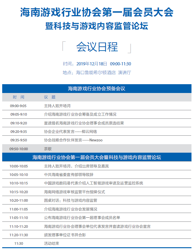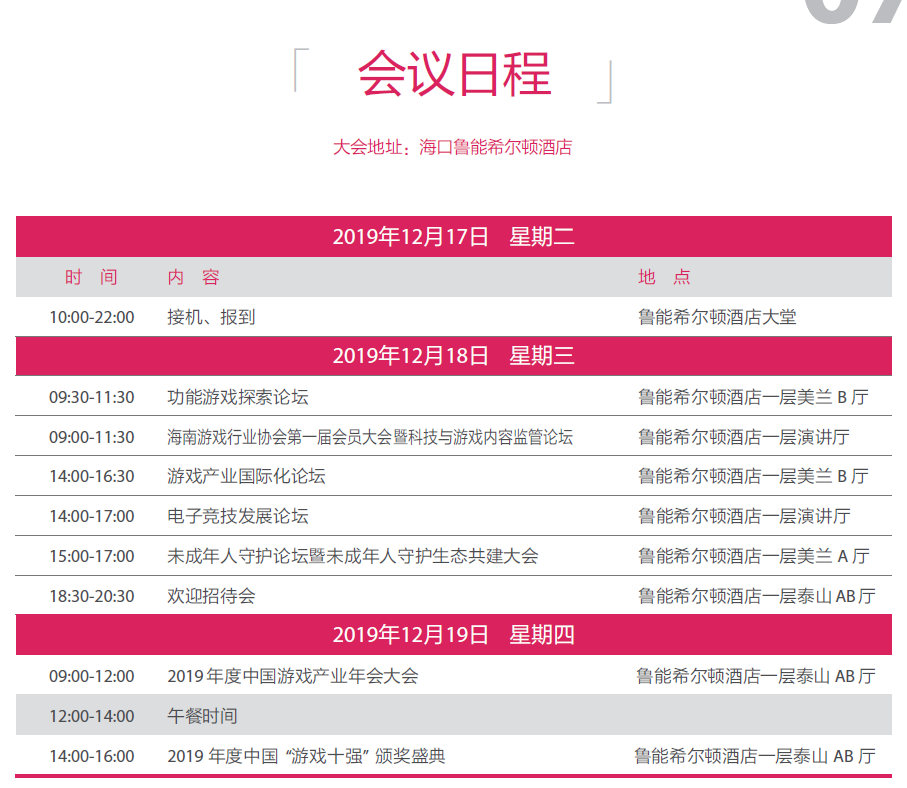 由国家资讯出版署主管,中国音像与数字出版协会、海南省资讯出版局、海南省工业和信息化厅主办,中国音数协游戏工委、海南生态软件园承办的2019年度中国游戏产业年会将于2019年12月17日至19日在海南海口市鲁能希尔顿酒店举办。随着大会举办日期日益临近,近日主办方公布了今年产业年会首日的各项活动日程,内容如下: 2019年度中国游戏产业年会 功能游戏探索论坛 游戏产业国际化论坛 电子竞技发展论坛 未成年人守护论坛暨未成年人守护生态共建大会 6 7 年会专题:http://2019.cgigc.com.cn/ 年会报名:http://51y4gk5q-1-1-2-1-1-1.eventdove.com/ |