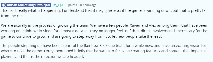 育碧旗下的多人战术射击游戏《彩虹六号:围攻》经过多年的开发与更新,目前已经成为了世界上最受欢迎的射击游戏之一,不过《彩虹六号:围攻》的新世代也将随着核心开发成员的离开而到来。创意总监 Xavier Marquis 与品牌总监 Alexandre Remy 已经宣布离开本作的开发团队,此外一些核心开发团队的其他人员也将离开,他们将投入到一个新项目的开发当中。 虽然有核心开发人员离开,但目前的《彩虹六号:围攻》开发成员中仍然包括了很多资深人员,像是游戏总监 Leroy Athanassoff。离开的品牌总监 Alexandre Remy 表示:“新的《围攻》开发团队已经成立了几周时间,他们将在未来的几周完全主导《围攻》的开发工作。”虽然他同时也强调,《彩虹六号:围攻》的开发团队将有连续性,并且这款作品将一直存在,但对于未来可能出现的一些变化目前仍然模糊不清。 Alexandre Remy 与此同时,《彩虹六号:围攻》社区经理 Craig Robinson 也在 Reddit 论坛上向玩家们保证“这绝不意味着《彩虹六号:围攻》将逐渐被抛弃”,Craig 表示《围攻》的开发团队目前仍然在扩大,像 Xavier 和 Remy 这样的老员工已经为这款作品努力了10年之久,他们也觉得让新人来主导这款作品是对《围攻》未来更好的选择。 Reddit 论坛截图 |