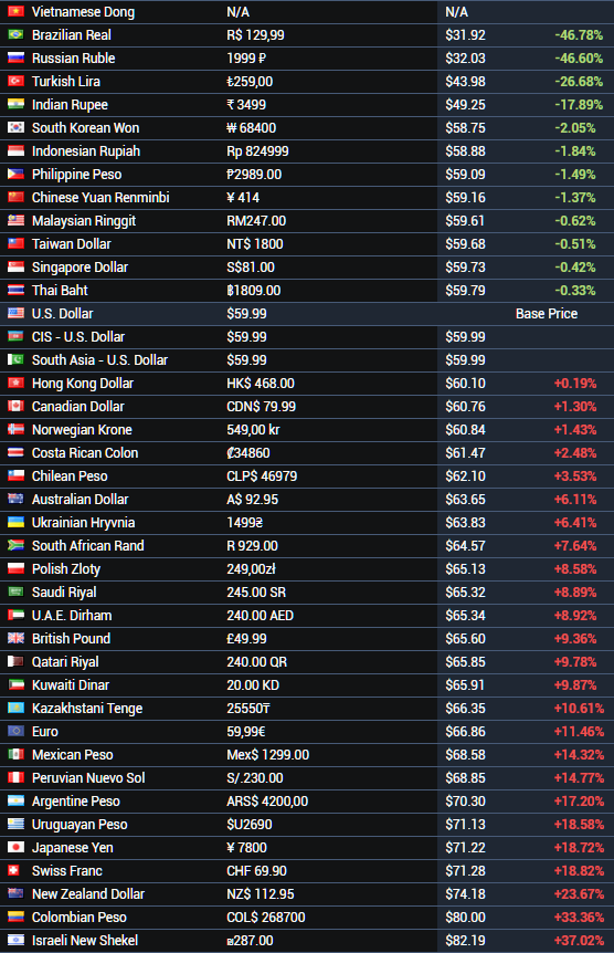 《生化危机3:重制版》昨天上架了Steam平台,国区售价414元,不少国内玩家都认为卡普空这个定价有些偏贵,虽然说是两款游戏捆绑销售,但是不光是国内玩家,Steam上不同地区定价的巨大差异也在国外网友中引起了很大争议。 上面这张图是Steam上《生化危机3:重制版》不同地区的定价,其中标准美区价格为59.99美元,但是以色列区的售价却高达287以色列新谢克尔(约合82.19美元),远比美区标准价格高出了37.02%,。而另外一边,巴西区的售价仅为129.99巴西雷亚尔(约合32.92美元),比美区标准价低了多达46.78%。 同时,两个时区相同的国家也出现了定价差异较大的问题,比如日本和韩国,美国和墨西哥。同一时区的日韩,日区售价为7800日元(约合71.22美元),但是却比韩区的售价高出了20.75%,后者仅售6.84万韩元(约合58.75美元)。同样,两国接壤的美国和墨西哥,墨西哥区的售价1299墨西哥比索(约合68.58美元),比美区标准价高出了14.32%。 目前,尚不清楚卡普空不同地区的定价规则,但是Steam已经不能像之前那样用俄区的低价来购买游戏了,希望卡普空能够尽快对定价差异作出调整,否则很容易被C组R组立马盯上。 《生化危机3:重制版》将于2020年4月3日登陆PC、PS4、Xbox One平台。 |