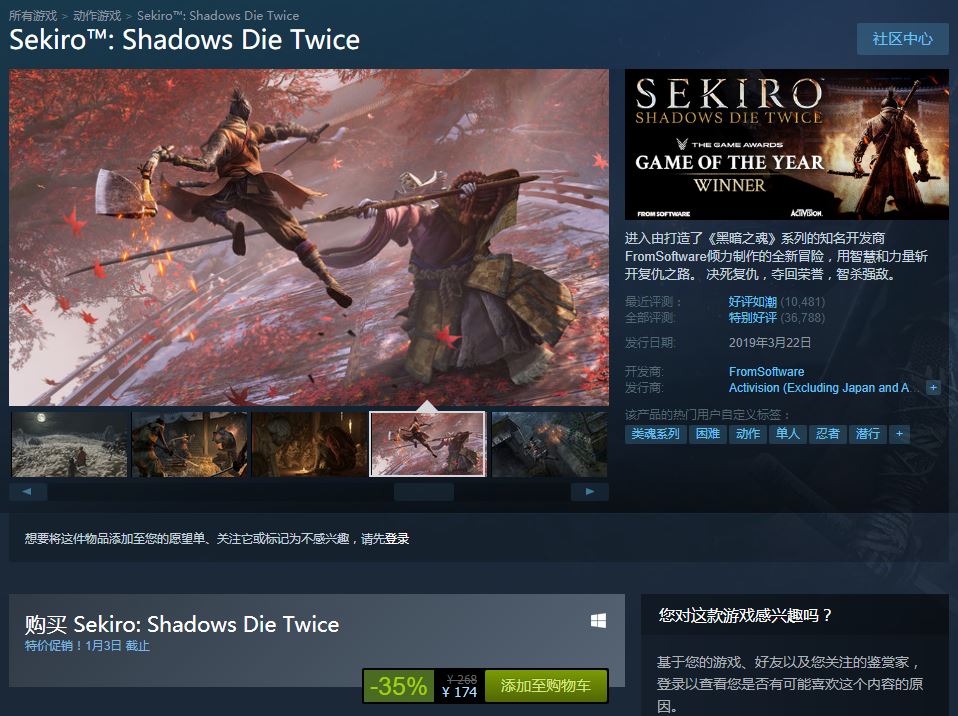 冬促偷跑? TGA年度游戏《只狼》史低价174元促销中