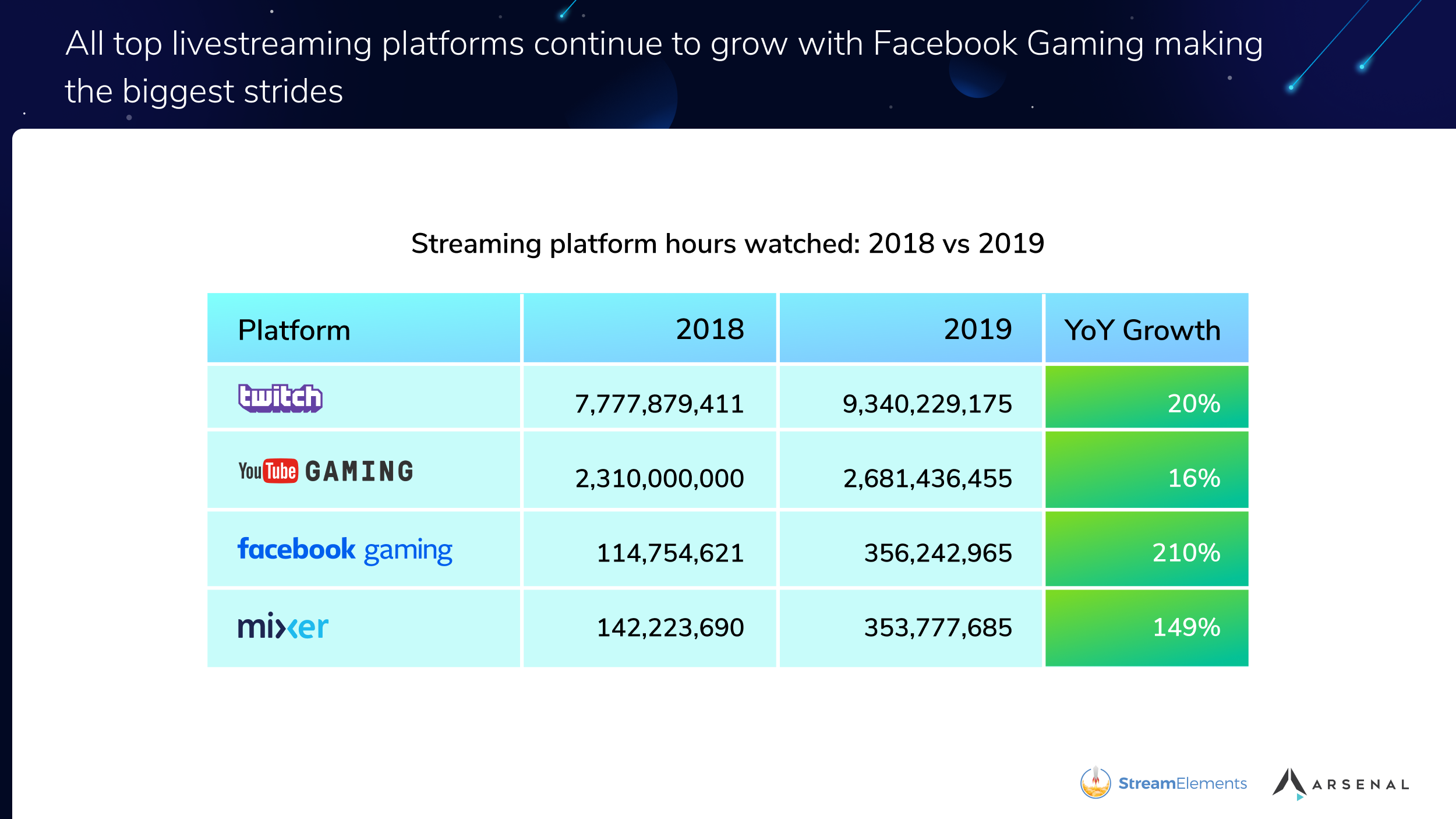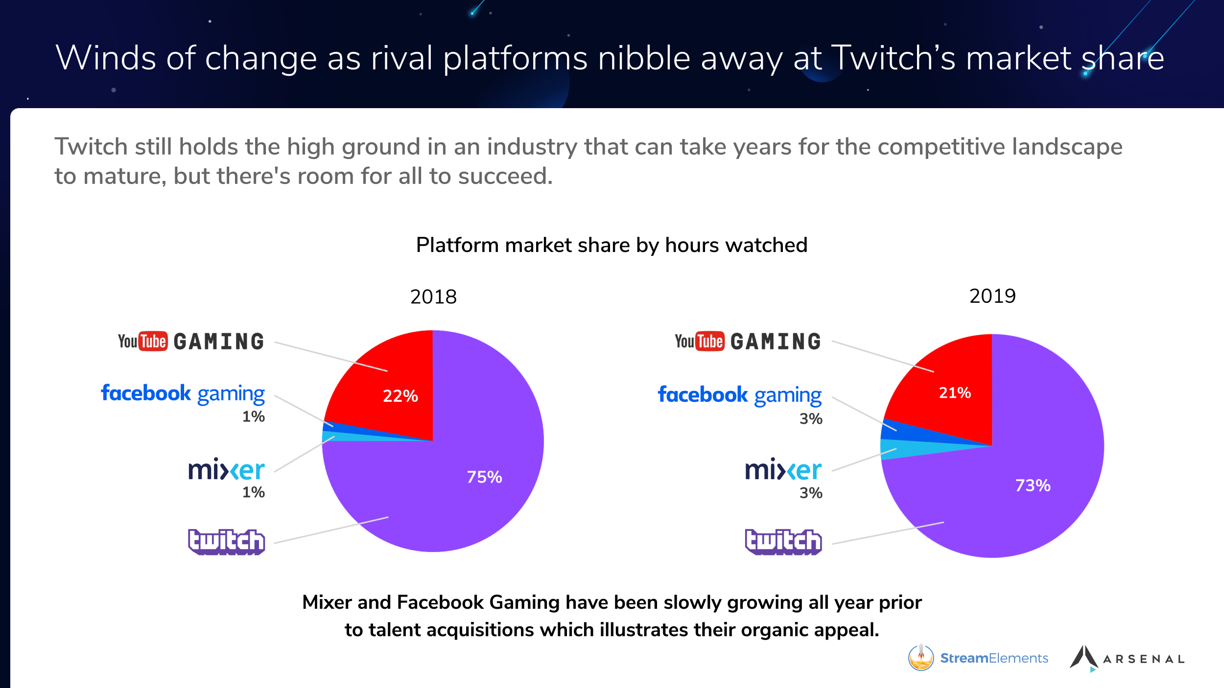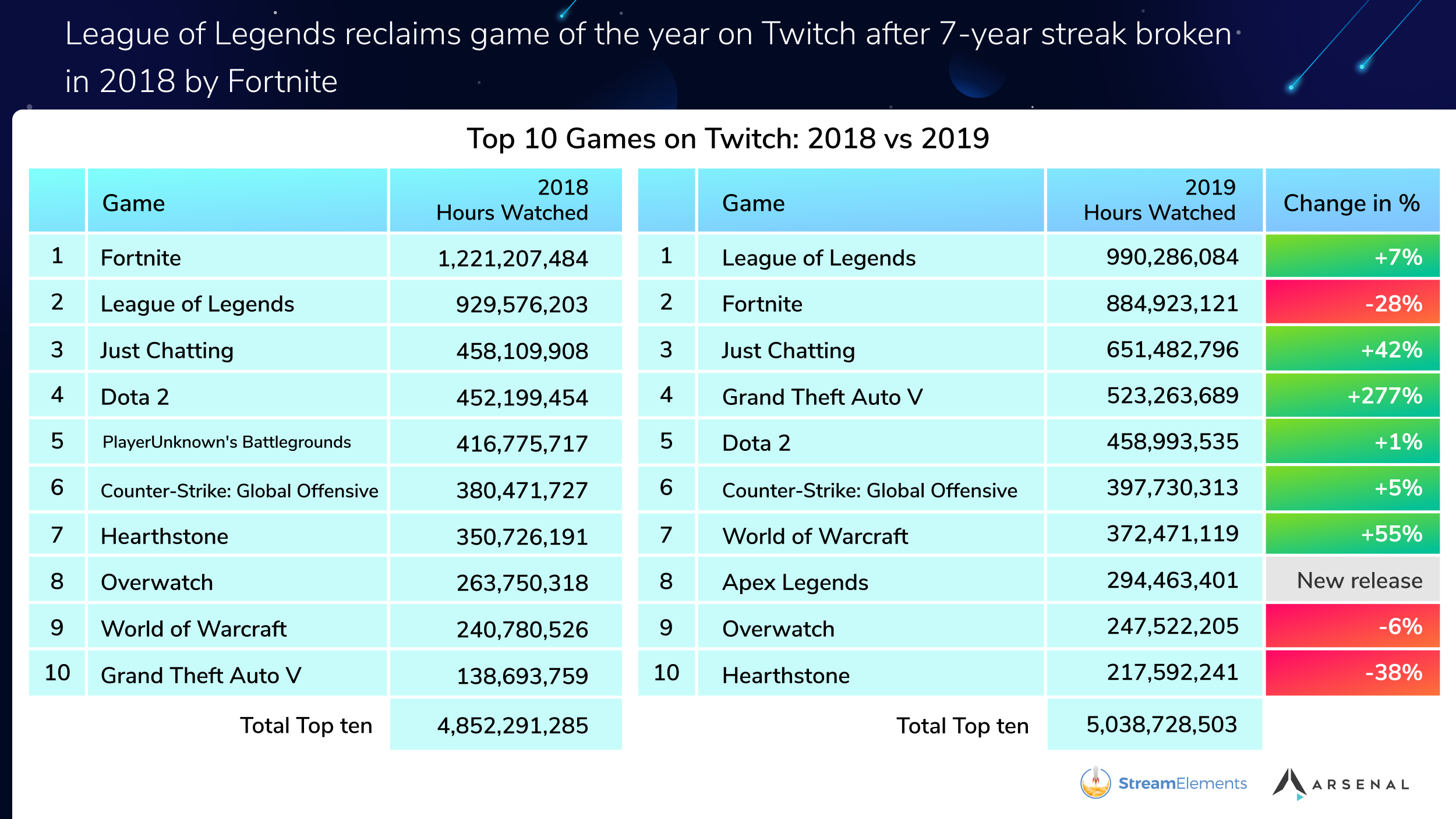 今天(12月20日)数据研究网站 StreamElements 公开了2019年度游戏平台研究报告,直播巨头 Twitch 在2019年所占的市场份额从去年的75%下降到了73%,微软主推的 Mixer 市场份额从去年的1%上涨到了3%。另外值得一提的是,《英雄联盟》终于重回2019年 Twitch 最受欢迎的游戏宝座,《堡垒之夜》的观看时长较去年大幅下降了28%。 可以看到,Mixer 与 YouTube Gaming 平台在2019年通过增加投资与挖走主播的方式成功提升了自己的市场份额,虽然从目前来看这个比重变化仍不明显,但是从未来看这两家平台的举措可能会产生深远影响。 与2018年相比,四家主流直播平台 Twitch、YouTube Gaming、Facebook Gameing、Mixer 的观看总时长均在上涨,但值得注意的是 Facebook 与 Mixer 的增长幅度更为巨大,分别达到了210%与149%。 2019年 Twitch 平台最受欢迎游戏榜也新鲜出炉,《英雄联盟》成功将《堡垒之夜》拉下了马,以9.9亿小时的观看时长位居榜首,去年大热的《堡垒之夜》同比大幅下降了28%,不过它依然是玩家规模最大的游戏之一。其中,《Apex 英雄》也成为了2019年 Twitch 最受欢迎的新游戏 IP。 2019年 Twitch 最受欢迎游戏榜: 1、《英雄联盟》 2、《堡垒之夜》 3、《Just Chatting》 4、《GTA V》 5、《DOTA 2》 6、《CS:GO》 7、《魔兽世界》 8、《Apex 英雄》 9、《守望先锋》 10、《炉石传说》 主播方面,著名《堡垒之夜》主播 Tfue 成为了本年度最受欢迎的主播,转投 Mixer 平台的 shroud 与 Ninja 的观看总时长(Twitch+Mixer)分别排在第2和4位。 |