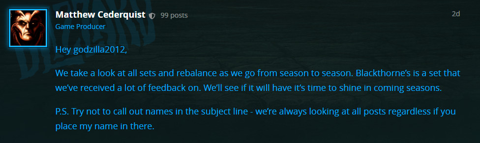 在暴雪《暗黑3》官网论坛上,有玩家喊话制作人Matthew问到是否计划做一些事情让黑荆棘套装变得更有用。 在《暗黑3》中,黑荆棘套装掉率非常高,但很多玩家并不喜欢这件套装,因为后期还会有更强力、和玩家技能本身挂钩的职业套装。所以尽管掉率很高,但一般都是被分解的命运。 不过根据Matthew本人的回答,黑荆棘套装说不定在将来会有用武之地。 Matthew回复说:“在我们从一个赛季到另外一个赛季过程中,我们会照顾所有的套装和再平衡。黑荆棘是一个我们已经收到了很多反馈的套装。在将来的赛季中它是否有发光发亮的机会,让我们拭目以待。” |