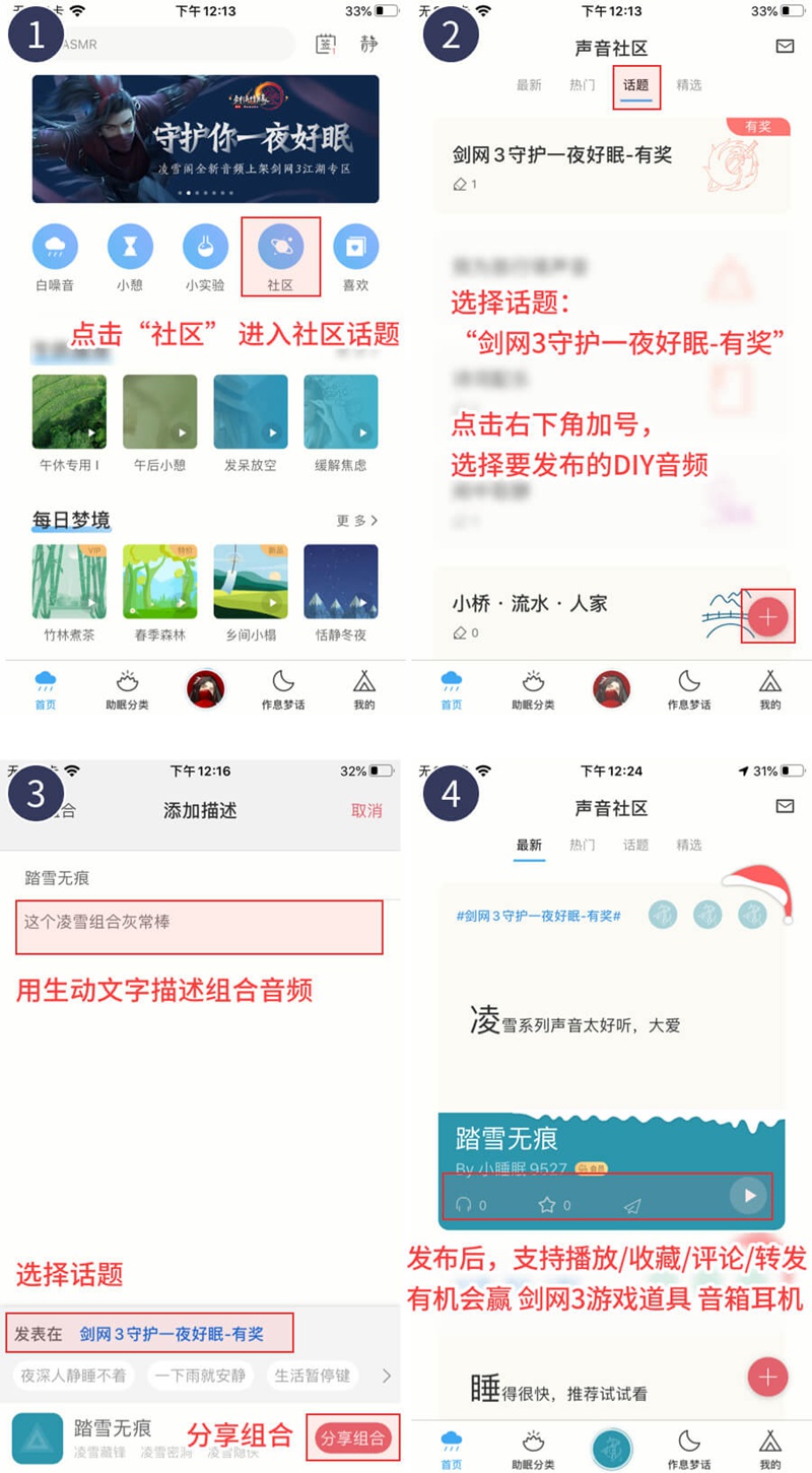 由《剑网3》音频团队实地采风,实物收音,精心整合的门派白噪音合集,自上架小睡眠APP后备受侠士好评!伴随着《剑网3》“凌雪藏锋”资料片的火爆公测,全新门派凌雪阁利刃出鞘,全新门派地图“凌雪阁”也出现在了侠士们的视线当中。即日起,《剑网3》全新“凌雪阁”门派场景自然音将正式上线小睡眠APP“江湖“专区及微信小程序!此后,无论是学习工作,还是失眠助眠,侠士都可以通过使用小睡眠APP,随时随地聆听来自《剑网3》江湖中的声音! 每一个热爱生活的人,都值得拥有好睡眠!小睡眠APP 作为5,000万人都在用的健康睡眠新概念应用, 为用户提供白噪音、冥想曲、助眠ASMR、爱豆哄睡、晚安电台、入睡提醒、睡眠监测、梦话录音、闹钟和午休小憩等诸多功能!以专业、全面和暖心的睡眠服务,令侠士们睡得更好睡得更香,并希望籍此唤起侠士们对睡眠重要性和睡眠质量的关注! 在睡眠管理基础上,小睡眠超棒氛围音也将是侠士们提高工作、学习、生活效率好帮手,更是用户冥想静心、灵感碰撞、阅读学习的小伴侣! 而作为小睡眠APP 的一大亮点,侠士们除了能够聆听到诸多江湖的声音外,还可自由体验小睡眠其独特的音频DIY玩法!通过将不同门派的音频进行随意组合,打造出属于侠士自己的江湖之声!此外,侠士还可前往参与小睡眠社区中参与话题互动,即有机会获得助眠大礼包!值得一提的是,小睡眠APP 现已上线微信小程序,侠士也可前往微信小程序收获这份来自《剑网3》的江湖之声哦! 除了全新上架的“凌雪阁”门派场景白噪音外,由@西山娱乐 所推出的偶像男团“JX3暗箱组合”,即日起也将强势进驻小睡眠APP爱豆哄睡专区,为侠士的睡眠质量保驾护航!还等什么,赶紧下载小睡眠APP 前往哄睡专区,收获偶像男团“JX3暗箱组合”为你精心准备的哄睡小福利吧! 与此同时,《剑网3·侠肝义胆沈剑心》第二季开播倒计时2天,12月27日起,每周五中午12:00在bilibili独家首播,倒计时海报今日曝光!沈剑心的定制应援计划也第二弹今日公布,当第二季总播放突破404万时,将解锁“《剑网3·侠肝义胆沈剑心》第二季OP全曲”!12月27日中午12:00,就让我们一同期待快乐源泉的强势归来吧。 《剑网3》冬至活动现已开启,除了全新的冬至活动“甜甜的温泉山庄”带来模拟经营的玩法外,还有全新节日活动背部挂件“雪娃娃”及2430装备等精美奖励等你来拿!“锦绣霓裳·年终盛典”也将同步开启,活动新增两款奖励双人奇趣坐骑轮椅“黄粱软椅”及活动限定表情动作“伏地”。诸多精彩内容,诚邀侠士前往体验! |