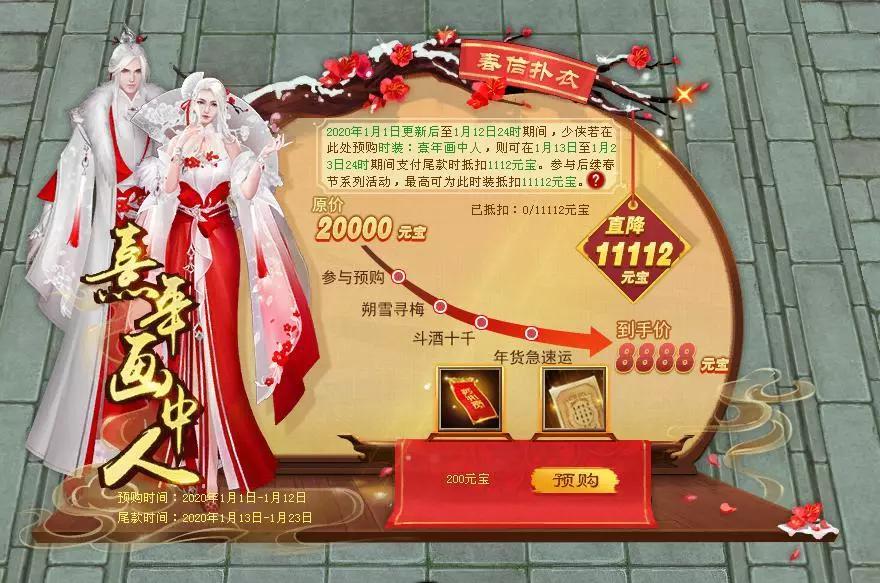 在即将过去的19年,我们共同经历了诸多难忘的瞬间,第一届天龙嘉年华天龙挚友许嵩携《雨幕》再度归来;与非物质文化遗产宋锦首度合作的时装:梦华录,除了在游戏中采用全新技术进行完美展示,更是制作了实体的宋锦外观;还有天龙第十三门派桃花岛与颠覆性玩法鬼市....2019的余额已经不足24小时,2020年将带着更多惊喜与福利来到我们的身边,新的12年,你准备好了吗? 新年穿新衣一直是我们庆祝的习俗,此次为了同贺新年,我们特别设计了时装:熹年画中人。更是准备了一系列折扣砍价活动帮助少侠们用更少的支出拿到属于自己的新时装!想要将他收入囊中的少侠一定不能错过本期时装预售活动大解析啦! 【全新时装:熹年画中人】 自然的鬼斧神工,让我们得以拥有不同的四时美景,你有没有想过将这份美丽制成新衣穿在身上?“故作小红桃杏色,尚余孤瘦雪霜姿。”冬日的红梅总是美的那般“漫不经心”却又“摄人心魂”。时装以红梅为灵感,红白配色迎合节日氛围,点点红英缀在衣角薄纱处,透显出一份轻盈,狐裘的搭配更是使得整体在清丽中带着矜贵自持。配合时装所推出的发型上有一只红梅暗自绽放,红梅既在画中,亦在发间,展现了画中景是眼前景,眼前人是心上人。这样一份特别的新年战袍,你不想拥有吗? 【春信扑衣】 活动时间:2020年1月1日更新后至1月23日24时 春信扑衣将为大家开启新衣折扣的大门,活动期间,少侠可消耗200元宝预购此时装,并获得1个抵扣券:1112元宝和1个钱引子:556金铢。若您拥有巅峰赛赛事竞猜称号:神机妙算料巅峰,更可免费参与预购。当然这样的折扣还远远不够,参与新年一系列活动可以获得最高共计11112元宝的抵扣额度,在1月13日0时至1月23日24时的尾款期间便可以最低8888元宝购买原价为20000元宝的时装:熹年画中人。 小提示:新年活动爆料将持续进行中,敬请期待哦 赠人玫瑰手有余香,想要多购买一件时装赠送他人的少侠,我们也准备了特别的第二件折扣!在1月6日更新后至1月19日24时期间,参与缘是吉祥活动获取四方角,使用四方角可每日随机一次折扣,四方角会自动保留已抽出的最低折扣。在尾款期间,已经支付第一件尾款的少侠便可使用此折扣再次购买第二件装备时绑定的时装:熹年画中人。 【经财有时】 活动时间:2020年1月1日更新后至2月7日24时 相信有不少少侠已经发现了在春信扑衣活动中掉落的1个钱引子:556金铢奖励,那么究竟他们有何妙用呢?活动期间,少侠们在游戏活动页中点击经财有时界面,便可参与活动。使用钱引子将金铢存入本金并每日计算利息,并可在2月1日0时至2月7日24时取出为等值的金铢用于在百戏集市内抵扣元宝消耗! 但是需要注意的是,只有在2020年1月1日更新后至1月31日24时期间,少侠可使用钱引子在您的本金中存入金铢。在2月1日0时之前,只要您拥有本金,每日24时都将会为您计算利息,为您的总资产增加2%。并在2月1日0时至2月7日24时期间,少侠可在此处连本带利将金铢取出,金铢可在百戏集市中抵扣元宝消耗。 你以为这些就够了吗?不!听说在1月6日开启的某个活动中,还可以获得一种叫做回息对牌神秘道具哦,使用回息对牌在领取收益时还可以额外获得一定百分比本金的金铢!想要了解更多折扣活动?敬请关注接下来的持续爆料吧! |