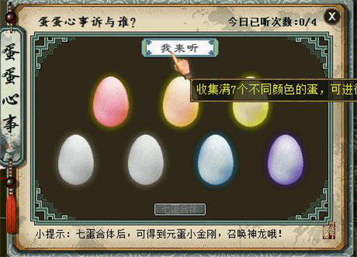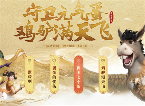守卫元气蛋,鸡驴满天飞。2020年1月1日-1月5日,大话新年元旦任务厚礼来袭!蛋藤啊、蛋蛋的忧伤、保卫七个蛋、鸡驴漫天飞四大玩法助力假日不寂寞,不仅有黄宝石、黄水晶、八荒遗风、幻兽精魄、聚魄丹、灵兽魂石等超级好礼相送,更有元旦专属好礼元气丹、变色丹送上! 蛋藤啊 子虚山上送海量经验 传说有座子虚山,山上有根乌有藤,藤上长了七个蛋。人们亲切地唤它作“蛋藤”。眼下正值岁首,蛋藤亟需照料。少侠不妨独自去长安东探望蛋藤,每天3次与其互动获得友好度,可摇动蛋藤获得丰厚经验奖励。 蛋蛋的忧伤 七蛋合体“召唤神龙” 蛋们都草筐里呆着,安稳舒坦,却自己造了个反。它们道人人均有烦恼,蛋亦有蛋的忧伤。不把咱的心结解开就想带咱走,不像话! 使用任务物品栏中的物品“蛋蛋心事”,听听蛋们的忧伤。“蛋蛋心事”道具会在首次获取元旦任务时一起得到。每倾听一次,都可获得丰厚的经验奖励,一旦倾听完7个蛋的心事,可“七蛋合体”,最后“召唤神龙”即有机会获得黄宝石、黄水晶、八荒遗风、幻兽精魄、聚魄丹、灵兽魂石在内的奖励! 保卫七个蛋 守护成熟的蛋蛋 胖大鬼们要抱着蛋迁徙到北俱芦洲了。这路远迢迢的,沿途有不少埋伏,你可得护着他们!3-5人组号队,找到任务NPC胖大鬼,变身后去指定地点吸引抢蛋贼(暗雷怪)上钩。其中真正的胖大鬼方阵所在的地图(Crtrl+1查看),遇怪的频率更高哦!成功保卫蛋蛋即有机会获得黄宝石、黄水晶、八荒遗风、幻兽精魄、聚魄丹、灵兽魂石等奖励。 温馨提示:前15个可获得物品奖励及经验奖励,之后则无奖励。 鸡驴满天飞 送你元旦专属好礼 北俱芦洲到了,却又被某些不速之客劫了道儿!3-5人组队,按“泥石怪—冥灵妃子—吉祥果—颜如玉—年”顺序首次击退北俱芦洲的5波不速之客,即可进入特别玩法“蛋打鸡飞”,将被传送到“孵蛋之地”,打退真正的鸡驴大神就可以获得大波好礼,除了黄宝石、黄水晶、八荒遗风、幻兽精魄、聚魄丹、灵兽魂石,这里可是还有元旦专属的元气丹、变色丹可以领取哦! 温馨提示:每人每天最多击杀2次,但只有第1次可获得奖励。 新的一年全新的开始,2020年1月1日-1月5日,四重活动上线伴你欢度元旦,海量经验、丰厚奖励、超级元气丹和变色丹通通上线送你!还等什么,赶紧组队,来拿奖励! |