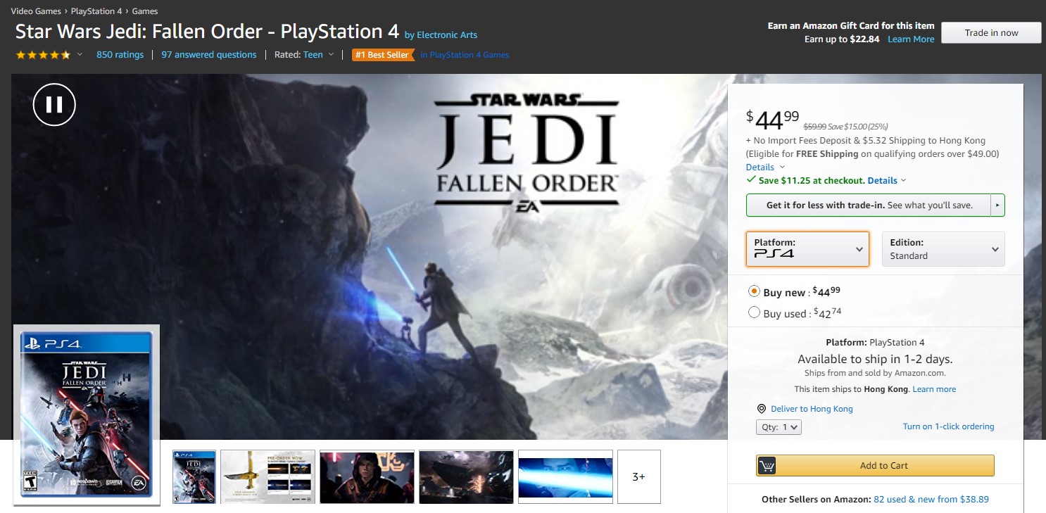 一年一度的“黑五”、“圣诞”大促已经结束了,很多玩家都在这波折扣浪潮中狠狠剁了一波手,但是也有很多玩家可能只收到了新“PS4”、“Xbox One”主机,却错过了游戏大促,近日,美亚上的《星球大战绝地:陨落的武士团》就开启了超低价促销。 美亚上的《星球大战绝地:陨落的武士团》实体版(PS4、Xbox One)原价59.99美元,现在折扣价44.99美元,在结算的时候还可以再享受11.25美元的优惠,最终结算价格33.74美元,约合人民币235元。如果大家的美亚账号还有Amazon Prime的话,还可以获得免费送货。 在《星球大战绝地:陨落的武士团》中,玩家扮演一名从66号密令的肃清行动中死里逃生的绝地学徒凯尔克提斯(Cal Kestis)。玩家在逃亡过程中将学会强大的新原力技能并掌握光剑之道。 《星球大战绝地:陨落的武士团》已于11月15日登陆PS4、Xbox One和PC(Steam、Origin、Epic)平台。 |