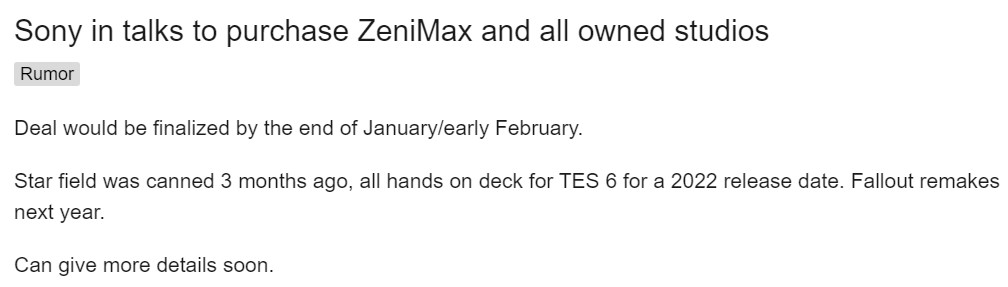 据传闻称,索尼一直在秘密谈判,希望收购知名发行商ZeniMax Media和其位于马里兰州的母公司旗下的所有子公司。根据几天前Reddit上的一个匿名帖子称,这笔交易将在2020年1月底或2月初完成,预计还会在未来几周内将发布声明。 这则匿名帖中写道:索尼正在谈判收购ZeniMax和其旗下所有的工作室。交易会在1月底或者2月初完成。《星空之地》(Star field)3个月前就做好了,《上古卷轴6》已经准备好将在2022年发售,《辐射》会在明年重制。 不用说,这个传闻听起来很荒唐。 如果索尼考虑收购 ZeniMax的话,这样的收购将让索尼付出惨重代价。 如果交易真的达成,收购总金额会远远超过微软为《我的世界》支付的25亿美元。 再者,收购ZeniMax的话索尼将付出巨大代价。 ZeniMax旗下拥有的一些工作室包括:B社,Arkane工作室,Tango游戏工作室, Machine游戏工作室,和Id Software。 更不用说这些工作室旗下还有许多重量级的IP,如《上古卷轴》、《辐射》、《耻辱》、《恶灵附身》、《德军总部》、《雷神之锤》、《狂怒》和《毁灭战士》。 光是《上古卷轴》这一IP就价值数十亿美元。所以,索尼希望收购ZeniMax只是一个空想。 当然,值得注意的是,爆料中称B社野心勃勃的科幻RPG《星空之地》已经制作完毕,而且《上古卷轴6》将于2022年发售,《辐射》会在2021年重制,这些消息也不知道是否可信。 |