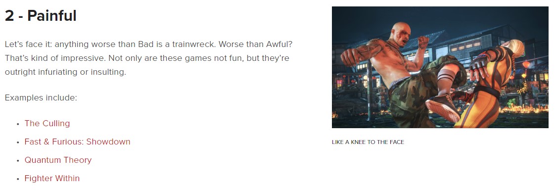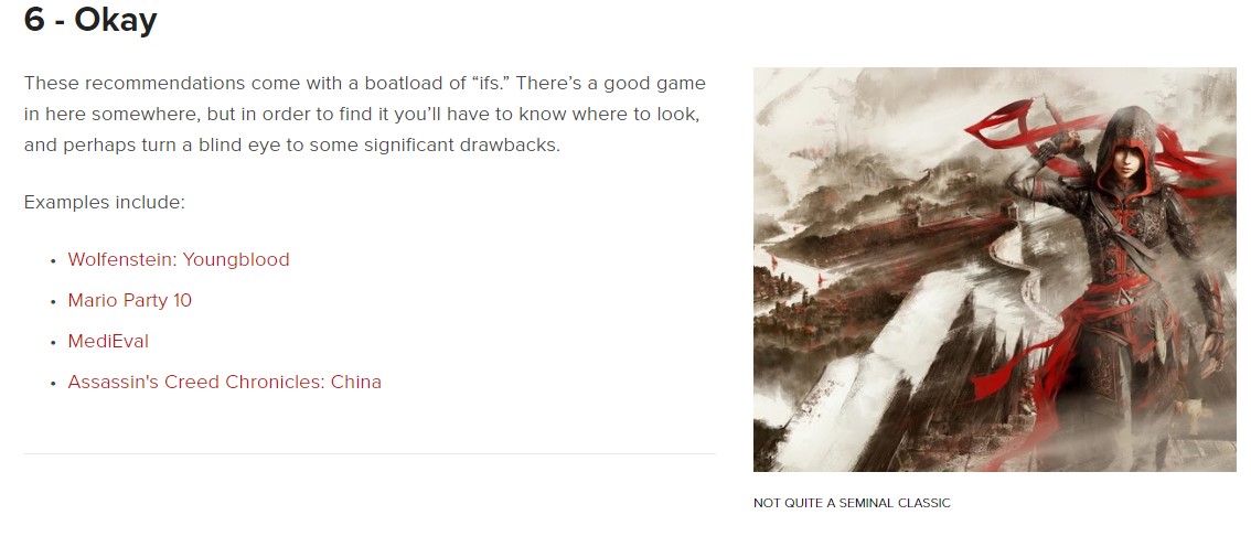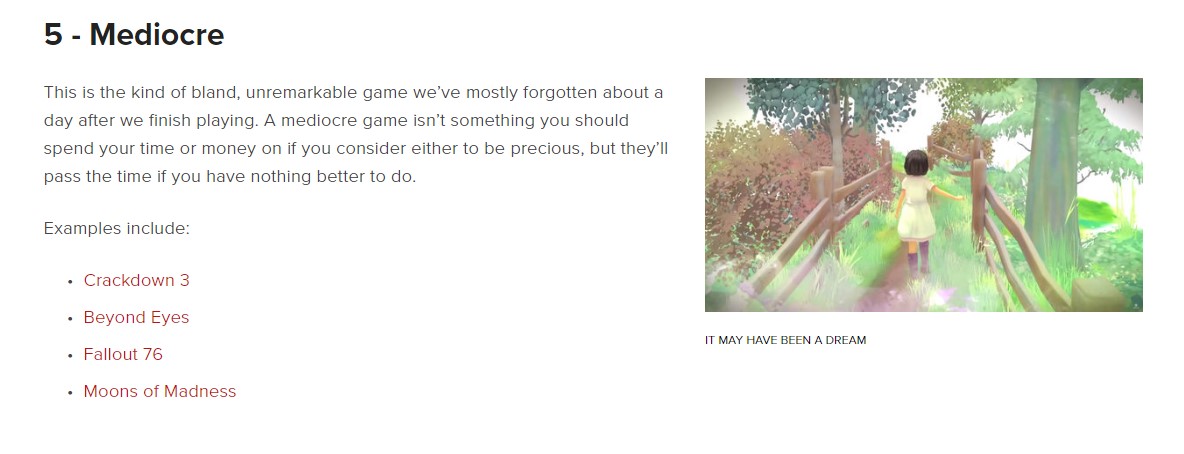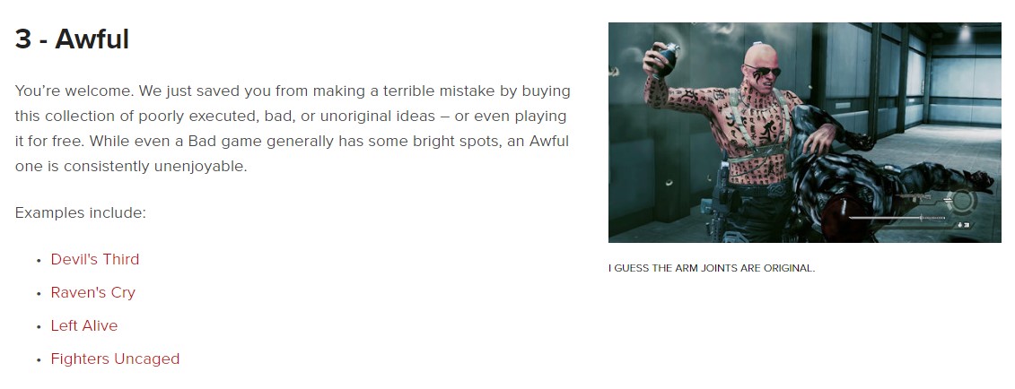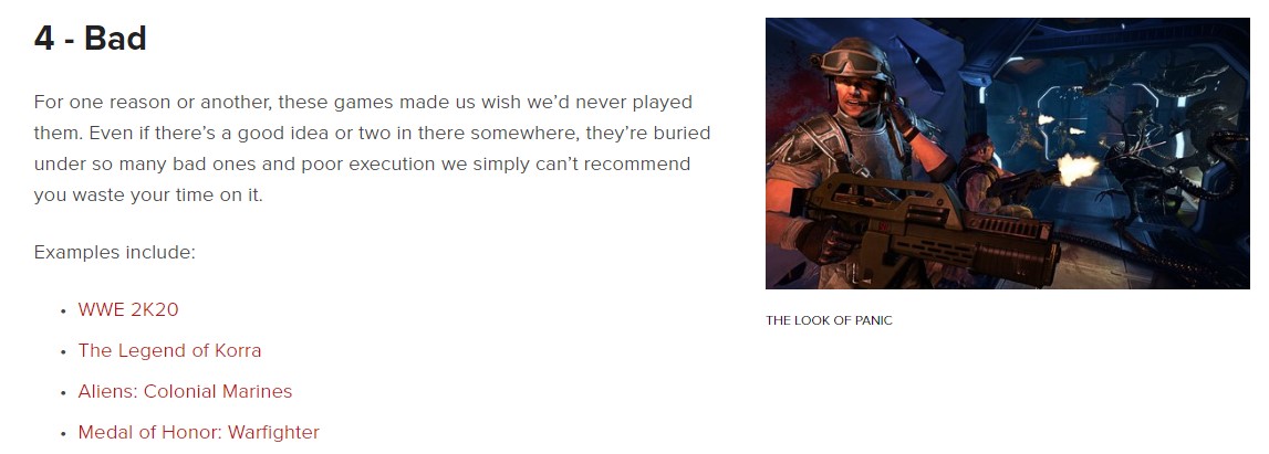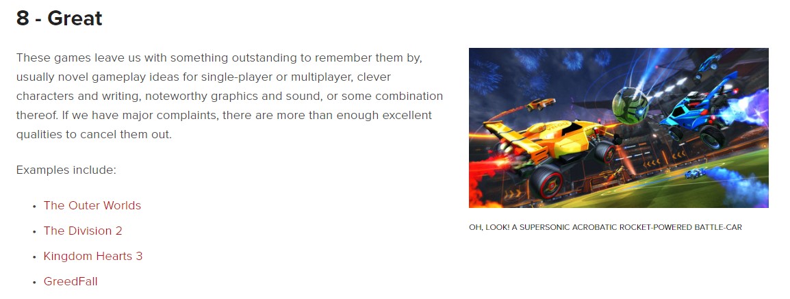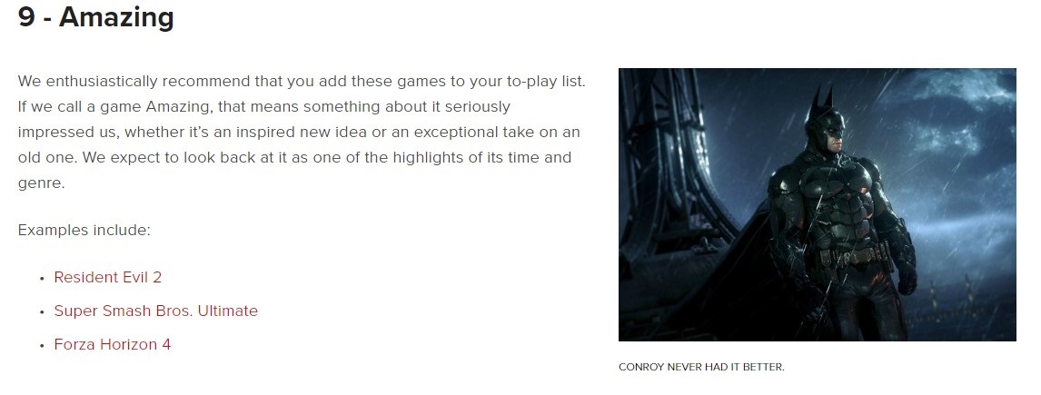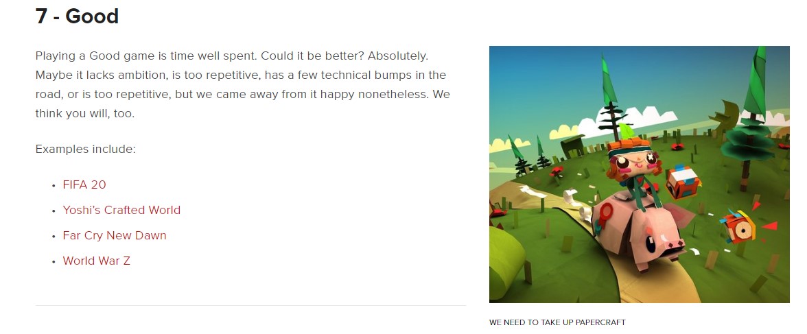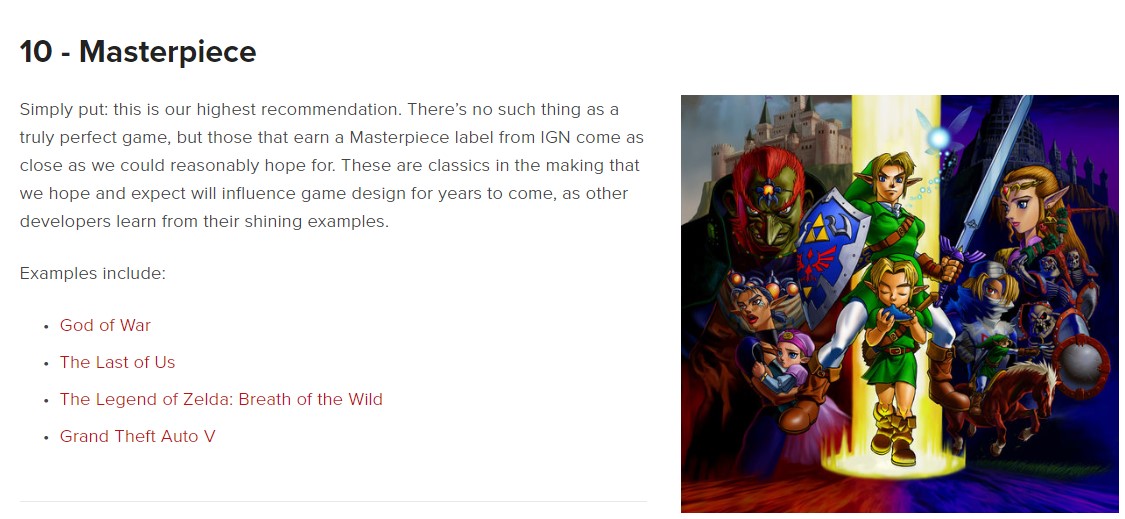 经常关注 IGN 评分的朋友一定曾看见过那些9.3分的神作,或是被给出6.5、6.6分等差强人意的作品,但是6.5和6.6的区别在哪里呢?也许 IGN 的编辑们自己一时也讲不清楚。不过这一切都将成为历史,IGN 已经在官方网站发布公告,此后他们将使用1~10的整数进行评分,每个分数都准确代表着一种含义,大家以后也无需因为零点几分的高低而产生不必要的争论,IGN 也可以更好地通过评分与玩家进行交流。 IGN 同时也公开了1~10不同分数所代表的的含义,简化来看可以归为以下标准: 10分——杰作 Masterpiece 9分——惊人 Amazing 8分——优秀 Great 7分——很好 Good 6分——还行 Okay 5分——普通 Mediocre 4分——不好 Bad 3分——糟糕 Awful 2分——痛苦 Painful 1分——难以忍受 Unbearable 当然,为了让玩家们可以更加直观地了解到每一档评分究竟可以指代哪些游戏,IGN 也为每档评分选出了几款标杆作品,例如满分“10分”档就有《战神》《最后生还者》《GTA V》《塞尔达传说:旷野之息》4款杰作入选。 10分——杰作 标杆游戏:《战神》《最后生还者》《塞尔达传说:旷野之息》《GTA V》 9分——惊人 标杆游戏:《生化危机 2》《任天堂全明星大乱斗:特别版》《极限竞速:地平线 4》 8分——优秀 标杆游戏:《天外世界》《全境封锁 2》《王国之心 3》《贪婪之秋》 7分——很好 标杆游戏:《FIFA 20》《耀西的手工世界》《孤岛惊魂:新曙光》《僵尸世界大战 Z》 6分——还行 标杆游戏:《德军总部:新血脉》《马里奥派对 10》《MadEval》《刺客信条编年史:中国》 5分——普通 标杆游戏:《除暴战警 3》《视觉至上》《辐射 76》《疯狂之月》 4分——不好 标杆游戏:《WWE 2K20》《降世神通:科拉传奇》《异形:殖民军》《荣誉勋章:战士》 3分——糟糕 标杆游戏:《恶魔三人组》《乌鸦的悲鸣》《生还者》《格斗解禁》 2分——痛苦 标杆游戏:《淘汰》《速度与激情:对决》《量子论》《格斗之心》 1分——难以忍受 标杆游戏:《红鼻子驯鹿鲁道夫》《Step Up》《自卫防身训练营》 |