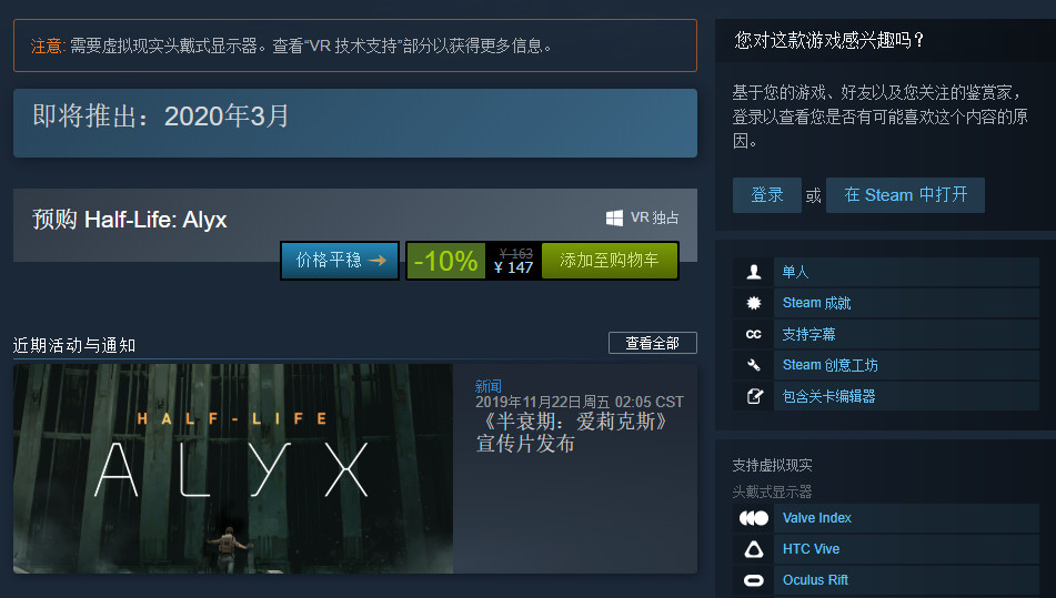 V社《半条命:Alyx》还未发售 目前已在9折促销