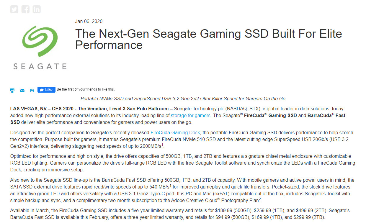 次世代主机PS5和Xbox Series Xbox都将标配超高速固态硬盘,这使得次世代主机首次在硬件上领先了PC,毕竟并不是每一个PC玩家都有SSD。而在今年的CES上,硬盘制造商希捷发布了两个即将到来的外置SSD解决方案——希捷酷玩(FireCuda)游戏SSD和希捷酷鱼(BarraCuda)Fast SSD。 官网介绍如下: 作为希捷最近发布的希捷酷玩游戏扩展坞的最佳拍档,这款便携式希捷酷玩SSD具备超高效能,助力游戏玩家在激烈的竞争中取得胜利。这款硬盘专为游戏玩家打造,将高端希捷酷玩NVMe固态510系列与最新的SuperSpeed USB 20Gb/秒(USB 3.2 Gen2×2)接口相结合,可提供高达2000MB/秒的惊人读取速度。 这款硬盘性能卓越且造型时尚,提供500GB、1TB和2TB的容量选择。其外观采用了工业风设计,并配有RGB LED特制灯效。游戏玩家可以使用免费的Seagate Toolkit 软件对硬盘RGB LED灯效进行全方位的个性化设置,并与希捷酷鱼游戏扩展坞的LED同步,打造沉浸式游戏体验。 希捷SSD系列的另一个新成员是希捷酷鱼Fast SSD,同样提供500GB、1TB和 2TB的容量选择。考虑到移动游戏玩家和高级用户的需求,该SATA SSD外置硬盘具备高达540MB/秒的超快读写速度,提升游戏体验并加快文件传输。这款硬盘外形时尚小巧,具有引人注目的绿色LED灯效,并通过USB 3.1 Gen2 Type-C 端口展示出其多功能性。该盘可与PC和Mac(exFAT)即插即用,并附赠具有备份和同步功能的Seagate Toolkit软件,以及两个月的Adobe Creative Cloud摄影计划免费订阅。 希捷酷玩游戏SSD将于今年3月上市,零售价分别为189.99美元 (500GB)、259.99美元(1TB) 和499.99美元(2TB)。 希捷酷鱼Fast SSD将于今年2月上市,零售价分别为94.99美元(500GB)、169.99美元(1TB) 和299.99美元(2TB)。 |