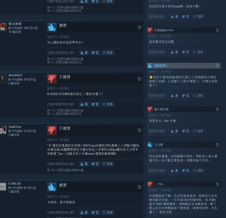 《怪物猎人:世界》大型DLC“冰原”Steam现已解锁,国区售价271元,该DLC需要额外购买本体游戏才能运行,游戏本体现已永降为203元。截止到目前,该DLC在Steam的评价为“多半好评”,好评率72%。根据国内玩家的留言反馈,大量玩家反应“冰原”DLC优化太差,CPU占用100%,连过场动画都是卡到只有几帧。 目前《怪物猎人:世界》豪华版339元,支持简繁中文、手柄、Steam云,有Steam成就。同时推出了大师版(包含游戏本体和冰原DLC):标准大师版406元,豪华大师版474元。 目前本作的标准版和豪华版已登上Steam国区销量榜和全球销量榜头名: 国区销量榜 全球销量榜 “卡”普空你是真的牛皮别人i99代cpu你都吃70%真就人人顶配才配玩冰原这dlc纯属喂屎现在不建议各位入手等优化吧ps属实亲儿子早半年就算了pc一出就卡死人卡婊nmsl 推荐的都是刷B i5-6500 GTX960表示阵亡。真的卡爆了! DLC对CPU的负优化过于严重!!! 本来可以正常游戏的,更新DLC后游戏卡得没有办法玩! 我的电脑可以游玩荒野大镖客2,全面战争和天国:拯救,最重要的是在怪物猎人世界没有更新冰原之前,我一直玩得好好的的,更新后直接卡的要死没法玩了,界面各种卡,CPU100%导致我什么都做不了。 明明画面并没有特别的改变和提升,为什么优化会变得如此差? 强烈地希望制作组能够优化一下,不要因为是PC就各种实验啊,也在乎在乎中低端游戏玩家的感受,毕竟DLC那么贵,大家都是因为特别喜欢这个游戏,才毫不犹豫的购买的。 特地给出评价是希望运营团队能够看到,优化CPU后会将评价改为好评!毕竟我是真的喜欢这个游戏,不然也不会花几百小时在里面,甚至这次因为购买DLC冰原导致我再也没法玩怪物猎人世界了,我都不会首先考虑退款!我仍然希望制作团队能尽快优化CPU100%的问题。 我特码的 冰原载入界面就不动了 然后cpu100% 试了十来次 卡到爆 什么垃圾优化 半夜爬起来下载,五点开始进游戏,到现在六点半啥龙都没打呢,一打开游戏CPU就100。 I5-7500 显卡1060 画质最低,30帧都没法流畅游戏。等了那么多天半夜爬起来下载安装,结果却这样,太失望了 。快优化吧 最低配置: 操作系统: 操作系统:WINDOWS? 7, 8, 8.1, 10 (必须为64-BIT) 处理器: Intel? Core? i5 4460 或 Core? i3 9100F 或 AMD FX?-6300 或 Ryzen? 3 3200G 内存: 8 GB RAM 显卡: NVIDIA? GeForce? GTX 760 或 GTX1050 或 AMD Radeon? R7 260x 或 RX 560 DirectX 版本: 11 网络: 宽带互联网连接 存储空间: 需要 48 GB 可用空间 声卡: 对应DirectSound(DirectX? 9.0c以上) 附注事项: ?可在画面设置为“低”、1080p/30fps的情况下进行游戏。 ?必须使用64位处理器与操作系统。 ?为使用DirectX 12 API,必须使用Windows 10(Version 1809以上)以及VRAM容量在4GB以上的GPU(图形处理器)。 推荐配置: 操作系统: WINDOWS?7, 8, 8.1, 10 (64-BIT 必須) 处理器: Intel? Core? i7 3770 或 Core? i3 8350 或 Core? i3 9350F 或 AMD Ryzen? 5 1500X 或 Ryzen? 5 3400G 内存: 8 GB RAM 显卡: NVIDIA? GeForce? GTX 1060(VRAM 3GB) 或 GTX 1650 或 AMD Radeon? RX 480 或 RX 570 DirectX 版本: 11 网络: 宽带互联网连接 存储空间: 需要 48 GB 可用空间 声卡: 对应DirectSound(DirectX? 9.0c以上) 附注事项: ?可在画面设置为“高”、1080p/30fps的情况下进行游戏。?必须使用64位处理器与操作系统。 ?为使用DirectX 12 API,必须使用Windows 10(Version 1809以上)以及VRAM容量在4GB以上的GPU(图形处理器)。 |