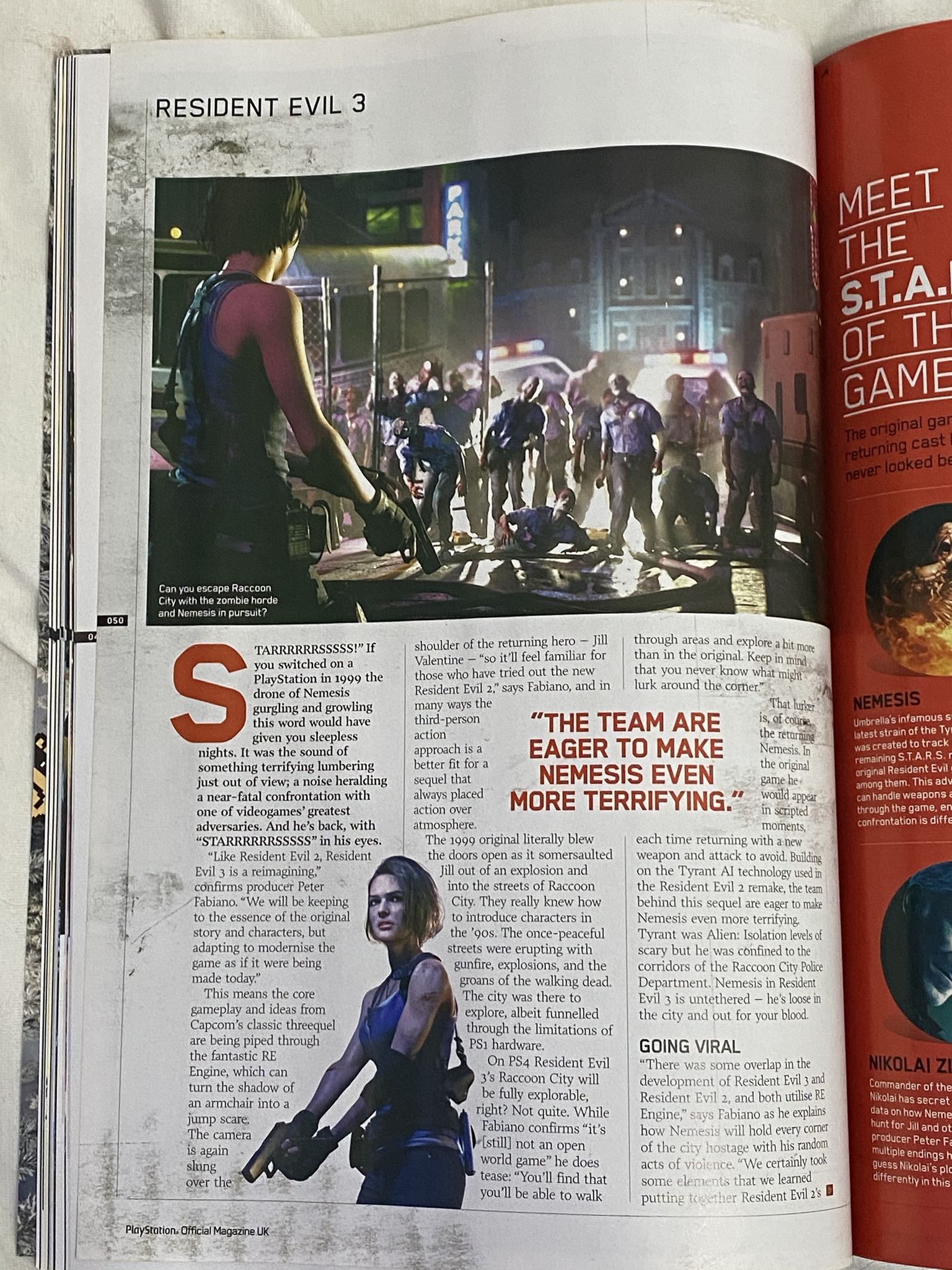 《生化危机3:重制版》是2020年最受期待的游戏之一,近日《生化危机3》制作人Peter Fabiano接受PlayStation官方杂志采访,透露了一些有趣的新细节。 Peter Fabiano表示《生化危机3:重制版》并非开放世界,但许多地区都能被探索;在本作中追击者AI得到增强。《生化危机3:重制版》不会有多结局和雇佣兵模式,这也让人有些遗憾。 细节汇总: 《生化危机3:重制版》并非开放世界,但城市中许多地区都能被探索。 追击者将采用《生化危机2:重制版》AI改进版。 在浣熊市,聆听声音很重要,你需要依靠声音判断是否会有即将到来的危险。 玩家将能进入街道、商店、Stagla加油站,医院,浣熊市资讯办公室。 开发组制作了追击者实体,然后通过摄影测量扫描入电脑,建立高清模型。 不会有佣兵模式。 蠕虫突变体——掘墓者将回归。 卡洛斯可玩。 不会有原版的动作选择机制,该机制会在游戏后给出不同分支或在危险中占据优势 没有多结局,尼古拉是否会幸存,还有谁将坐上直升机跑路不得而知。 《生化危机3:重制版》将于4月3日发售,登陆PS4、Xbox One和PC平台。 杂志扫图: |